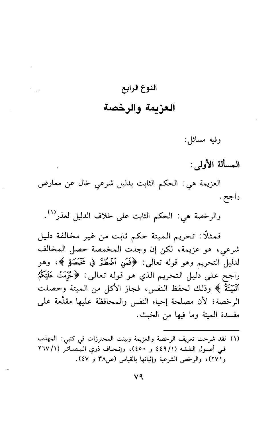 فمثلاً: تحريم الميتة حكم ثابت من غير مخالفة دليل شرعي، هو عزيمة، لكن إن وجدت المخمصة حصل المخالف لدليل التحريم وهو قوله تعالى: (فَمَنِ اضطُرَّ فِى مَخمصَةٍ)، وهو راجح على دليل التحريم الذي هو قوله تعالى: (حُرِّمَت عَلَيْكُمُ الْمَيْتَةُ) وذلك لحفظ النفس، فجاز الأكل من الميتة وحصلت الرخصة؛ لأن مصلحة إحياء النفس والمحافظة عليها مقدَمة على مفسدة الميتة وما فيها من الخبث.