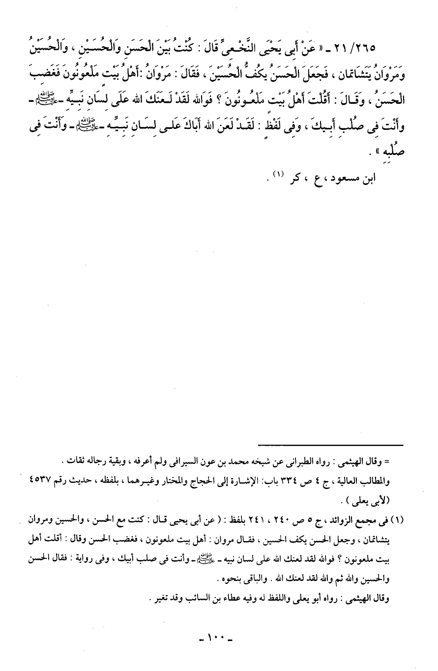 265/ 21 - "عَنْ أَبِى يَحْيَى النَّخْعِىَّ قَالَ: كُنْتُ بَيْنَ الْحَسَنِ وَالْحُسَيْنِ، وَالْحُسَيْنُ وَمَرْوَانُ يَتَشَاتمان، فَجَعَلَ الْحَسَنُ يكُفُّ الْحُسَيْنَ، فَقَالَ: مَرْوَانُ: أَهْلُ بَيْتٍ مَلْعُونُونَ فَغَضِبَ الْحَسَنُ، وَقَالَ: أَقُلْتَ أَهْلُ بَيْتٍ مَلْعُونُونَ؟ فَوَالله لَقَدْ لَعَنَكَ الله عَلَى لِسَانِ نَبِيِّهِ - صلى الله عليه وسلم - وأَنْتَ فِى صُلْبِ أَبِيكَ، وَفِى لَفْظٍ: لَقَدْ لَعَنَ الله أَبَاكَ عَلى لِسَانِ نَبِيِّهِ - صلى الله عليه وسلم - وَأَنْتَ فِى صُلْبِهِ".