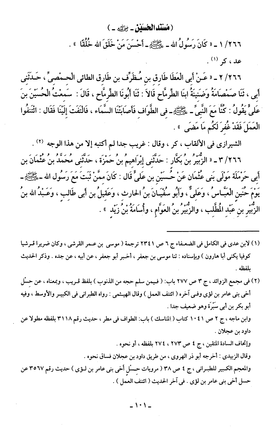 266/ 2 - "عَنْ أَبِى الْعَطَا طَارِقِ بنِ مُظَرِّف بن طَارِق الطائى الْحِمْصِىِّ، حَدَثَنِى أَبِى، ثَنَا صَمْصَامَةُ وَضَنِينَةُ ابنَا الطِّرمَّاح قَالَا: ثَنَا أَبُونَا الطِّرِمَّاح، قَالَ: سَمِعْتُ الْحُسَيْنَ بنَ عَلىٍّ يَقُولُ: كُنَّا مَعَ النَّبِىِّ - صلى الله عليه وسلم - فِى الطَّوَافِ فَأَصَابَتْنَا السَّمَاء، فَالْتَفَتَ إِلَيْنَا فَقَال: ائْتَنفُوا الْعَمَلَ فَقَدْ غُفِرَ لَكُم مَا مَضَى".