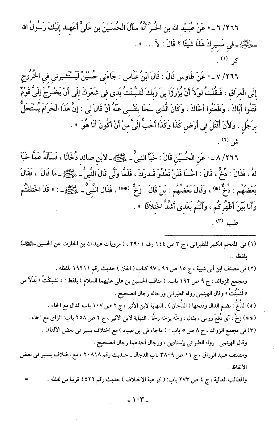 266/ 6 - "عَنْ عُبَيْدِ الله بن الحُرِّ أَنَّهُ سَأَلَ الْحُسَيْنَ بن عَلىٍّ أَعَهِد إِلَيْكَ رَسُولُ الله - صلى الله عليه وسلم - فِى مَسِيرِكَ هَذَا شَيئًا؟ قَالَ: لَا ... ".