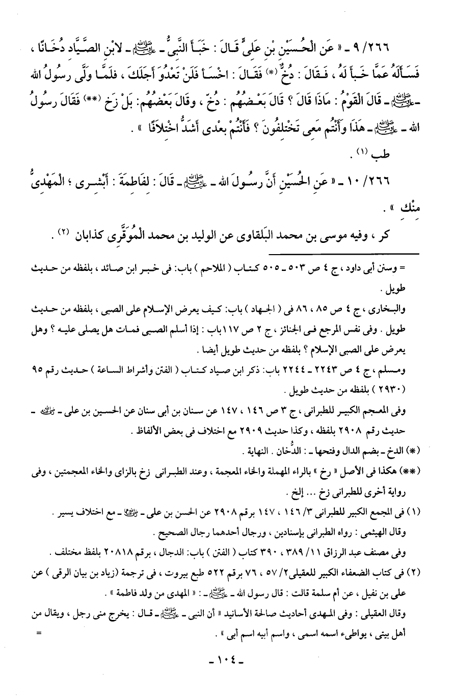 266/ 9 - "عَن الْحُسَيْنِ بْنِ عَلِىٍّ قَالَ: خَبَأَ النَّبِىُّ - صلى الله عليه وسلم - لابْنِ الصَّيَّادِ دُخَانًا، فَسَأَلَهُ عَمَّا خَبأَ لَهُ، فَقَالَ: دُخٌّ (*) فَقَالَ: اخْسَأ فَلَنْ تَعْدُوَ أَجَلَكَ، فلَمَّا وَلَّى رسُولُ الله - صلى الله عليه وسلم - قَالَ الْقَوْمُ: مَاذَا قَالَ؟ قَالَ بَعْضُهُم: دُخّ، وقَالَ بَعْضُهُم: بَلْ زخَ (* *) فَقَالَ رسُولُ الله - صلى الله عليه وسلم - هَذَا وَأَنْتُم مَعِى تَخْتلِفُونَ؟ فَأَنْتُمْ بعْدى أَشَدُّ اخْتِلَافًا".