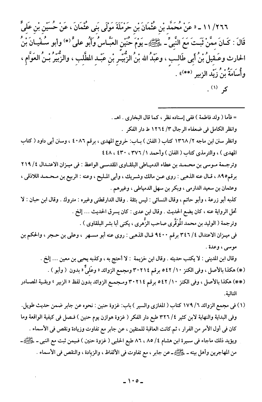 266/ 11 - "عَنْ مُحَمَّد بْنِ عُثْمَانَ بْنِ حَرْمَلَةَ مَوْلَى بَنِى عُثْمَانَ، عَنْ حُسَيْنِ بْنِ عَلِىٍّ قَالَ: كَانَ مِمَّنْ ثَبَتَ مَعَ النَّبِىِّ - صلى الله عليه وسلم - يَوْمَ حُنَيْنٍ العَبَّاسُ وَأَبُو علىٍّ (*) وأبو سُفْيانَ بْنُ الحارث وعَقِيلُ بْنُ أَبِى طَالِبٍ، وعَبْدُ الله بْنُ الزُّبَيْرِ بْنِ عَبْدِ المطَّلِبِ، والزُّبَيْرُ بْنُ العَوَّامِ، وأُسَامَةُ بْنُ زَيْد الزبير (* *) ".