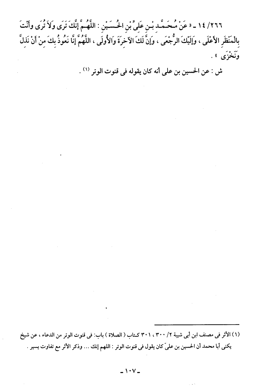 (¬1) الأثر في مصنف ابن أبى شيبة 2/ 300، 301 كتاب (الصلاة) باب: في قنوت الوتر من الدعاء، عن شيخ يكنى أبا محمد أن الحسين بن على كان يقول في قنوت الوتر: اللهم إنك ... وذكر الأثر مع تفاوت يسير.