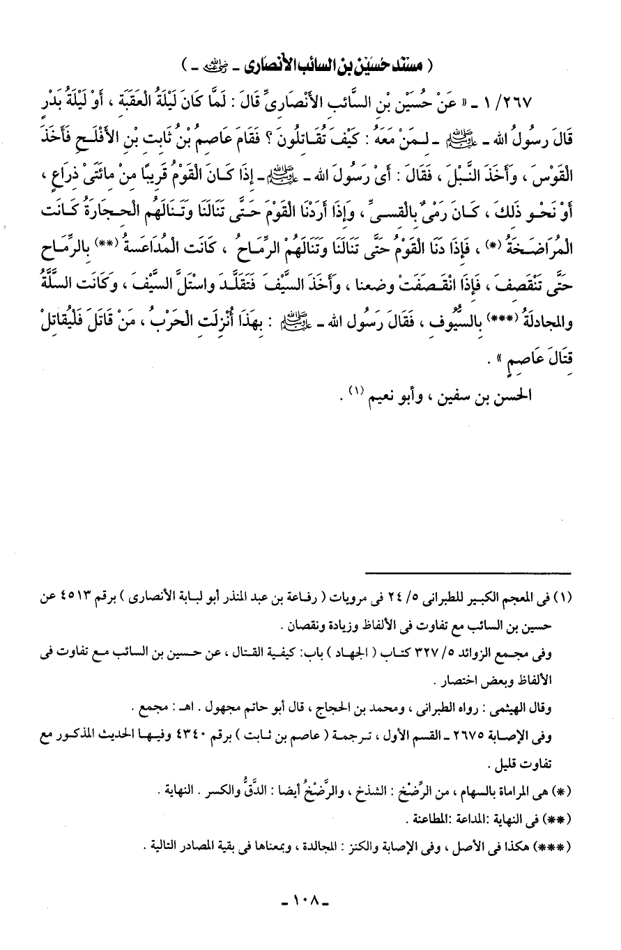 267/ 1 - " عَنْ حُسَيْن بْنِ السَّائبِ الأَنْصَارِىِّ قَالَ: لَمَّا كَانَ لَيْلَةُ الْعَقَبَةِ، أَوْ لَيْلَةُ بَدْرٍ قَالَ رسُولُ الله - صلى الله عليه وسلم - لِمَنْ مَعَهُ: كَيْفَ تُقَاتِلُونَ؟ فَقَامَ عَاصِمُ بْنُ ثَابِتِ بْنِ الأَفْلَحِ فَأَخَذَ الْقَوْسَ، وَأَخَذَ النَّبْلَ، فَقَالَ: أَىْ رَسُولَ الله - صلى الله عليه وسلم - إِذَا كَانَ الْقَوْمُ قَرِيبًا مِنْ مائَتَىْ ذِرَاعٍ، أَوْ نَحْو ذَلِكَ، كَانَ رَمْىٌ بالْقِسىِّ، وَإِذَا أَرَدْنَا الْقَوْمَ حَتَّى تَنَالَنَا وَتَنَالَهُم الْحِجارَةُ كَانَت الْمُرَاضَخَةُ (*)، فَإِذَا دَنَا الْقَوْمُ حَتَّى تَنَالَنَا وَتَنَالَهُمْ الرِّمَاحُ، كَانَت المُدَاعَسةُ (* *) بِالرِّمَاح حَتَّى تَنْقَصِفَ، فَإِذَا انْقَصَفَتْ وضعنا، وَأَخَذَ السَّيْفَ فَتَقَلَّدَ واسْتَلَّ السَّيْفَ، وَكَانَت السَّلَّةُ والمجادلَةُ (* * *) بِالسُّيُوفِ، فَقَالَ رَسُول الله - صلى الله عليه وسلم -: بِهَذَا أُنْزِلَتِ الْحَرْبُ، مَنْ قَاتَلَ فَلْيُقاتِلْ قِتَالَ عَاصِمٍ".