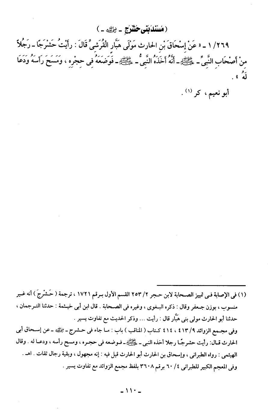 269/ 1 - " عَنْ إِسْحَاقَ بْنِ الحارث مَوْلَى هَبَّارٍ الْقُرَشِىِّ قَالَ: رأَيْتُ حَشْرَجًا - رَجُلًا مِنْ أَصْحَابِ النَّبِىَّ - صلى الله عليه وسلم - أَنَّهُ أَخَذَهُ النَّبِىُّ - صلى الله عليه وسلم - فَوَضَعَهُ فِى حِجْرِهِ، وَمَسَحَ رَأسَهُ وَدَعَا لَهُ".