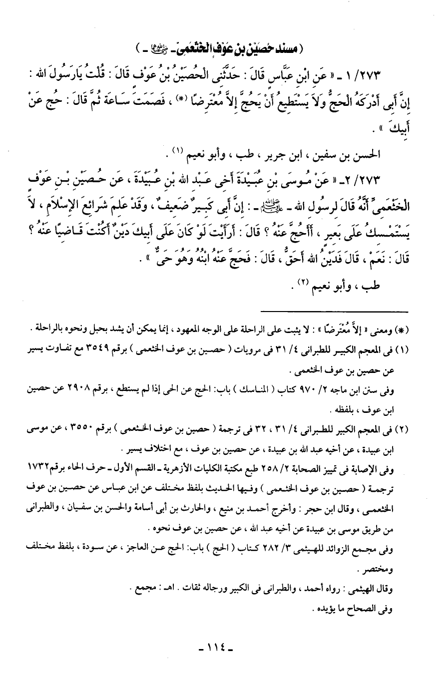273/ 1 - " عَنِ ابْنِ عَبَّاسٍ قَالَ: حَدَّثَنِى الْحُصَيْنُ بْنُ عَوْفٍ قَالَ: قُلْتُ يَا رَسُولَ الله: إِنَّ أَبِى أَدْرَكَهُ الْحَجُّ وَلَا يَسْتَطِيعُ أَنْ يَحُجَّ إِلَّا مُعْتَرِضًا (*)، فَصَمَتَ سَاعَة ثُمَّ قَالَ: حُج عَنْ أَبِيكَ".
