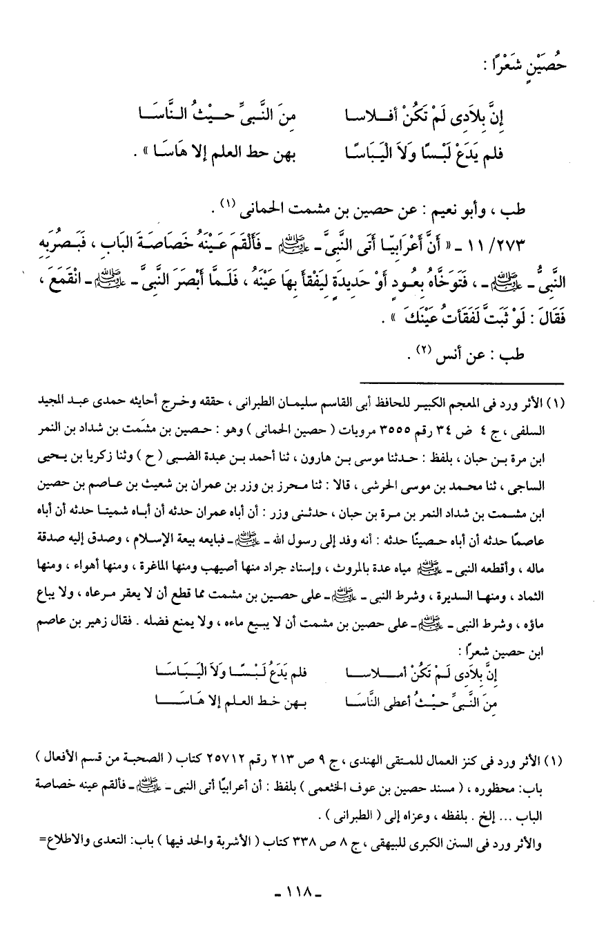 (¬1) الأثر ورد في المعجم الكبير للحافظ أبى القاسم سليمان الطبرانى، حققه وخرج أحاديثه حمدى عبد المجيد السلفى، ج 4 ص 34 رقم 3555 مرويات (حصين الحمانى) وهو: حصين بن مشَمت بن شداد بن النمر بن مرة بن حبان، بلفظ: حدثنا موسى بن هارون، ثنا أحمد بن عبدة الضبى (ح) وثنا زكريا بن يحيى الساجى، ثنا محمد بن موسى الحرشى، قالا: ثنا محرز بن وزر بن عمران بن شعيث بن عاصم بن حصين بن مشمت بن شداد النمر بن مرة بن حبان، حدثنى وزر: أن أباه عمران حدثه أن أباه شميتا حدثه أن أباه عاصمًا حدثه أن أباه حصينًا حدثه: أنه وفد إلى رسول الله - صلى الله عليه وسلم - فبايعه بيعة الإسلام، وصدق إليه صدقة ماله، وأقطعه النبى - صلى الله عليه وسلم - مياه عدة بالمروث، وإسناد جراد منها أصيهب ومنها الماغرة، ومنها أهواء، ومنها الثماد، ومنها السديرة، وشرط النبى - صلى الله عليه وسلم - على حصين بن مشمت مما قطع أن لا يعقر مرعاه، ولا يباع ماؤه، وشرط النبى - صلى الله عليه وسلم - على حصين بن مشمت أن لا يبيع ماءه، ولا يمنع فضله. فقال زهير بن عاصم بن حصين شعرًا: