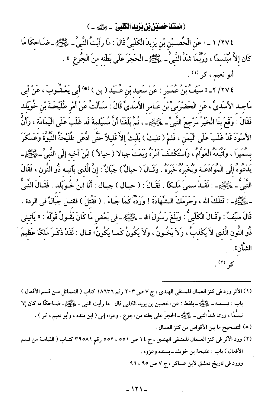 274/ 1 - " عَنِ الْحُصيْنِ بْنِ يَزِيدَ الْكَلْبِىِّ قَالَ: مَا رأَيْتُ النَّبِىَّ - صلى الله عليه وسلم - ضَاحِكَا مَا كَان إِلَّا مُبْتَسِمًا، وَرُبَّمَا شَدَّ النَّبِىُّ - صلى الله عليه وسلم - الْحَجَرَ عَلَى بَطْنِهِ مِنَ الْجُوعِ".