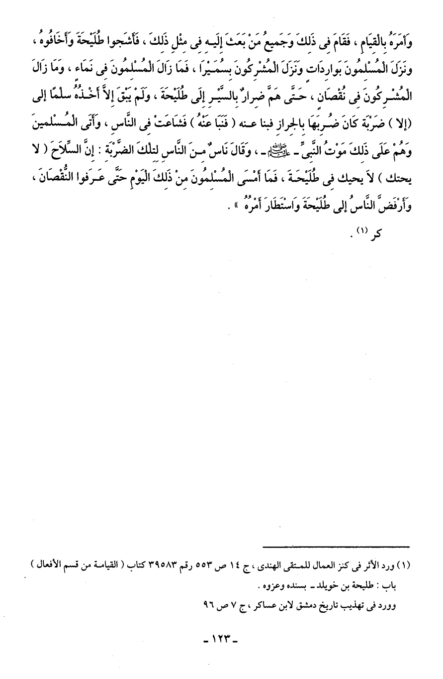 (¬1) ورد الأثر في كنز العمال للمتقى الهندى، ج 14 ص 553 رقم 39583 كتاب (القيامة من قسم الأفعال) باب: طليحة بن خويلد - بسنده وعزوه.