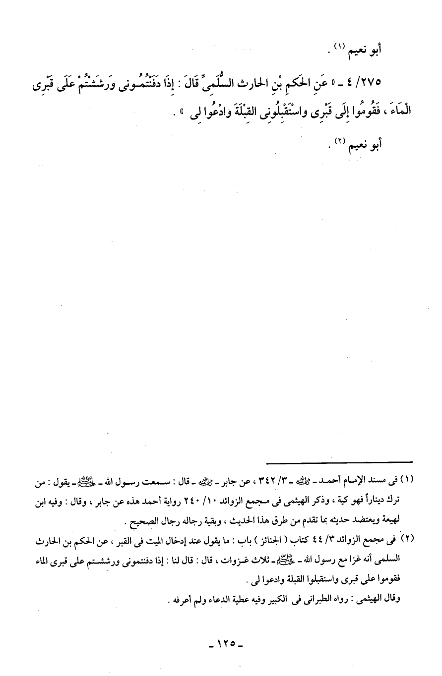 275/ 4 - "عَنِ الحَكمِ بْنِ الحارث السُّلَمِىِّ قَالَ: إِذَا دَفَنْتُمُونى وَرشَشْتُمْ عَلَى قَبْرِى الْمَاءَ، فَقُومُوا إِلَى قَبْرِى واسْتَقْبِلُونِى القِبْلَةَ وادْعُوا لِى".