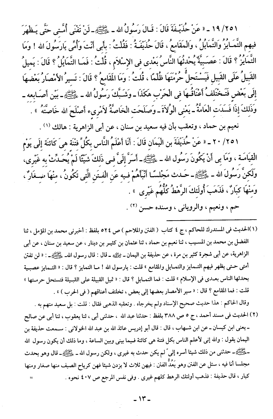 251/ 20 - "عَنْ حُذَيْفَةَ بن الْيَمَانِ قَالَ: أَنَا أَعْلَمُ النَّاس بِكُلِّ فِتْنَةٍ هِىَ كَائنَة إِلَى يَوْمِ الْقِيَامَةِ، وَمَا بِى أَنْ يَكُونَ رَسُول الله - صلى الله عليه وسلم - أَسَرَّ إِلَىَّ فِى ذَلِكَ شَيْئًا لَمْ يُحَدِّثْ بِهِ غَيْرِى، وَلَكِنَّ رَسُولَ الله - صلى الله عليه وسلم - حَدث مَجْلِسًا أَنْبَأَهُمْ فِيهِ عَنِ الْفِتَنِ الَّتِى تَكُونُ، مِنْهَا صِغَارٌ، وَمِنْهَا كِبَارٌ، فَذَهَبَ أُولَئِكَ الرَّهْطُ كُلُّهُم غَيْرِى".