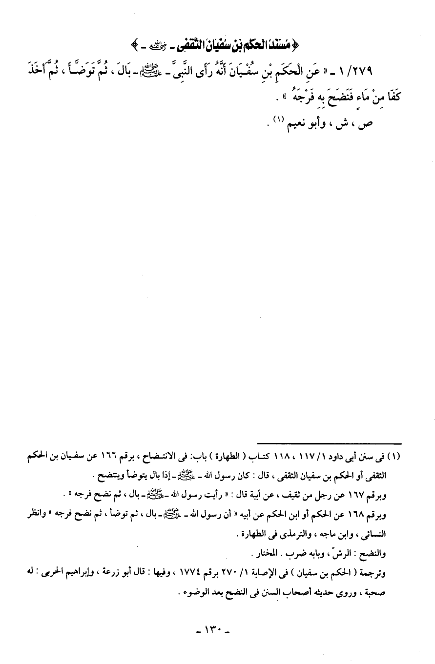 279/ 1 - " عَنِ الْحَكَمِ بْنِ سُفْيَانَ أَنَّهُ رَأَى النَّبِىَّ - صلى الله عليه وسلم - بَالَ، ثُمَّ تَوَضَّأَ، ثُمَّ أَخَذَ كَفّا مِنْ مَاءٍ فَنَضَحَ بِهِ فَرْجَهُ".