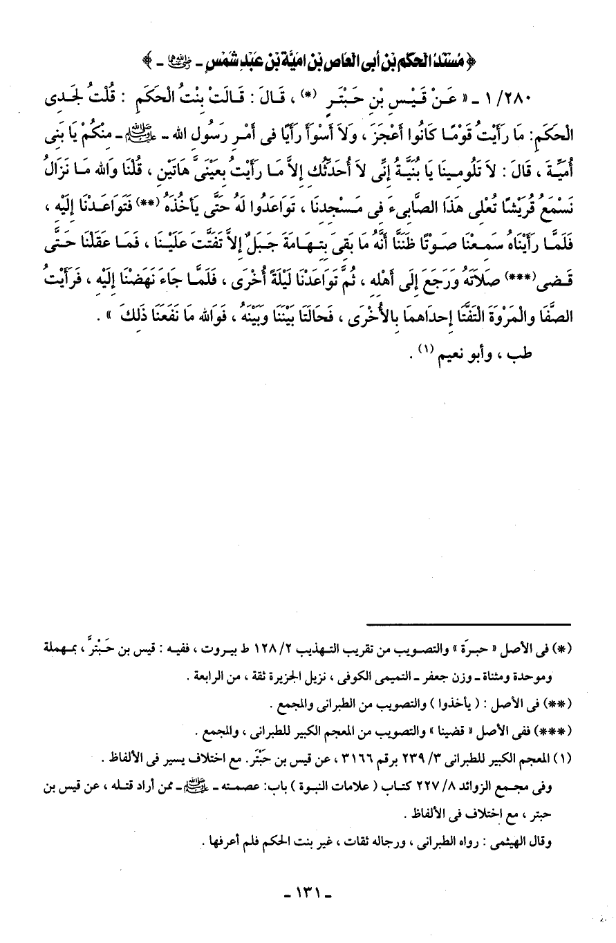 280/ 1 - " عَنْ قَيْسِ بْنِ حَبْتَرٍ (*)، قَالَ: قَالَتْ بِنْتُ الْحَكَمِ: قُلْتُ لجَدِى الْحَكَمِ: مَا رَأَيْتُ قَوْمًا كَانُوا أَعْجَزَ، وَلَا أَسْوَأَ رَأَيًا في أَمْرِ رَسُولِ الله - صلى الله عليه وسلم - مِنْكُمْ يَا بَنِى أُمَيَّةَ، قَالَ: لَا تَلُومِينَا يَا بُنَيَّةُ إِنِّى لَا أُحَدَّثُكِ إِلَّا مَا رَأَيْتُ بِعَيْنَىَّ هَاتَيْنِ، قُلْنَا وَالله مَا نَزَالُ نَسْمَعُ قُرَيْشًا تُعْلِى هَذَا الصَّابِئَ فِى مَسْجِدِنَا، تَوَاعَدُوا لَهُ حَتَّى يَأخُذَهُ (* *) فَتَوَاعَدْنَا إِلَيْهِ، فَلَمَّا رَأَيْنَاهُ سَمِعْنَا صَوْتًا ظَنَنَّا أَنَّهُ مَا بَقِىَ بِتِهَامَةَ جَبَلٌ إِلَّا تَفَتَّتَ عَلَيْنَا، فَمَا عَقَلْنَا حَتَّى قَضى (* * *) صَلَاتَهُ وَرَجَعَ إِلَى أَهْلِهِ، ثُمَّ تَوَاعَدْنَا لَيْلَةً أُخْرَى، فَلَمَّا جَاءَ نَهَضْنَا إِلَيْهِ، فَرَأَيْتُ الصَّفَا والْمَرْوَةَ الْتَفَّتَا إِحدَاهمَا بِالأُخْرَى، فَحَالَتَا بَيْنَنَا وَبَيْنَهُ، فَوَالله مَا نَفَعَنَا ذَلِكَ".