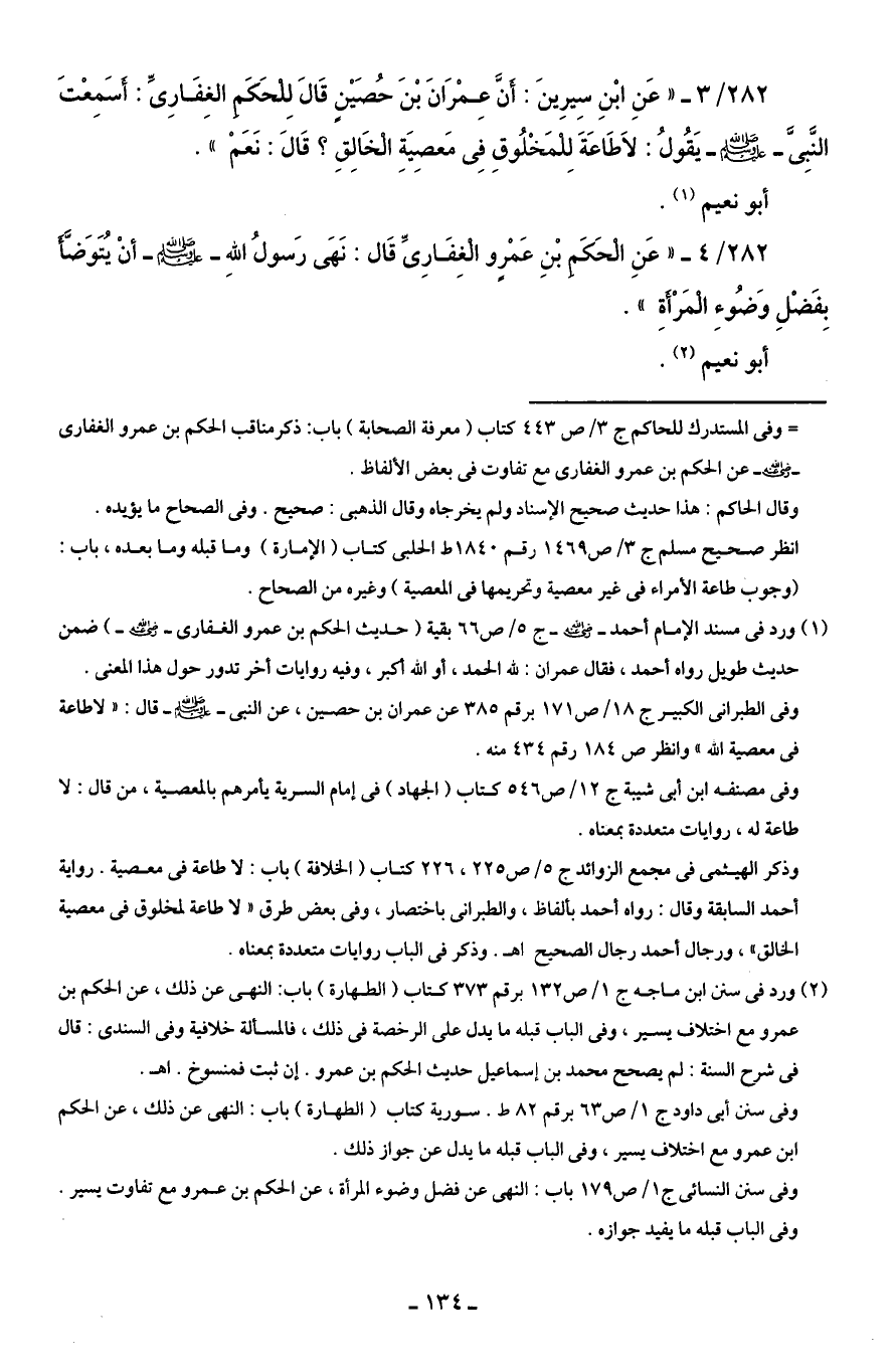 282/ 3 - "عَنِ ابْنِ سِيرِينَ: أَنَّ عِمْرَانَ بْنَ حُصَيْنٍ قَالَ لِلْحَكَمِ الغِفَارِىِّ: أَسَمِعْتَ النَّبِىَّ - صلى الله عليه وسلم - يَقُولُ: لَا طَاعَةَ لِلْمَخْلُوقِ فِى مَعصِيَةِ الْخَالِقِ؟ قَالَ: نَعَمْ".