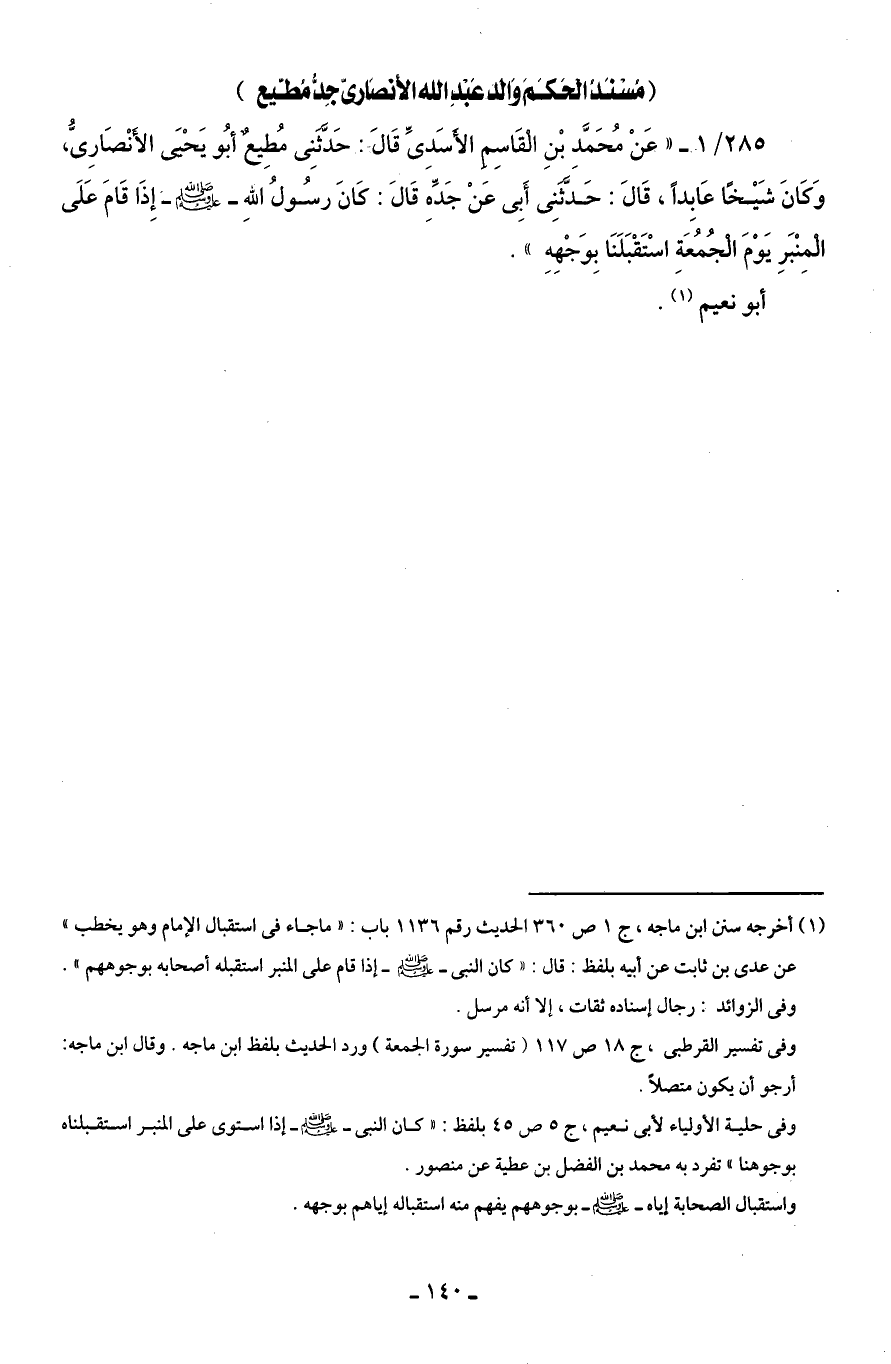 285/ 1 - " عَنْ مُحَمَّدِ بْنِ الْقَاسِمِ الأَسَدِىِّ قَالَ: حَدَّثَنِى مُطِيعٌ أبُو يَحْيَى الأَنْصَارِىُّ، وَكَانَ شَيْخًا عَابِدًا، قَالَ: حَدَّثَنِى أَبِى عَنْ جَدِّهِ قَالَ: كَانَ رسُولُ اللهِ - صلى الله عليه وسلم - إِذَا قَامَ عَلَى الْمِنْبَرِ يَوْمَ الْجُمُعَةِ اسْتَقْبَلَنَا بِوَجْهِهِ".