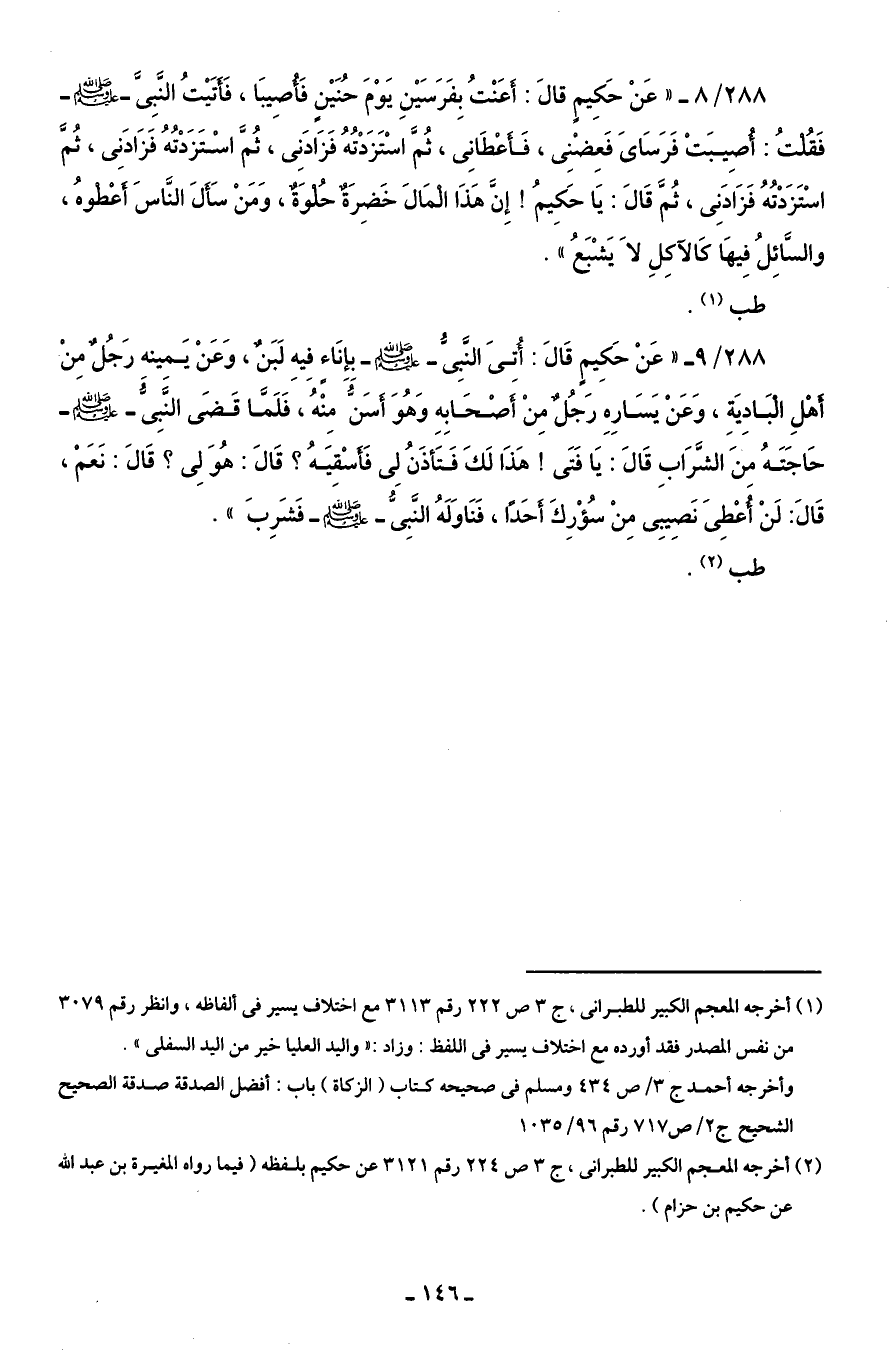 288/ 8 - "عَنْ حَكِيمٍ قالَ: أَعَنْتُ بِفَرَسَيْنِ يَوْمَ حُنَيْنٍ فَأُصِيبَا، فَأَتَيْتُ النَّبِىَّ - صلى الله عليه وسلم - فَقُلْتُ: أُصِيبَتْ فَرَسَاىَ فَعِضْنِى، فَأعْطَانِى، ثُمَّ اسْتَزَدْتُهُ فَزَادَنِى، ثُمَّ اسْتَزَدْتُهُ فَزَادَنِى، ثُمَّ اسْتَزَدْتُهُ فَزَادَنِى، ثُمَّ قَالَ: يَا حَكِيمُ! إِنَّ هَذَا الْمَالَ خَضِرَةٌ حُلْوَةٌ، وَمَنْ سَأَلَ النَّاسَ أَعْطوهُ، والسَّائِلُ فِيهَا كَالآكِلِ لَا يَشْبَعُ".