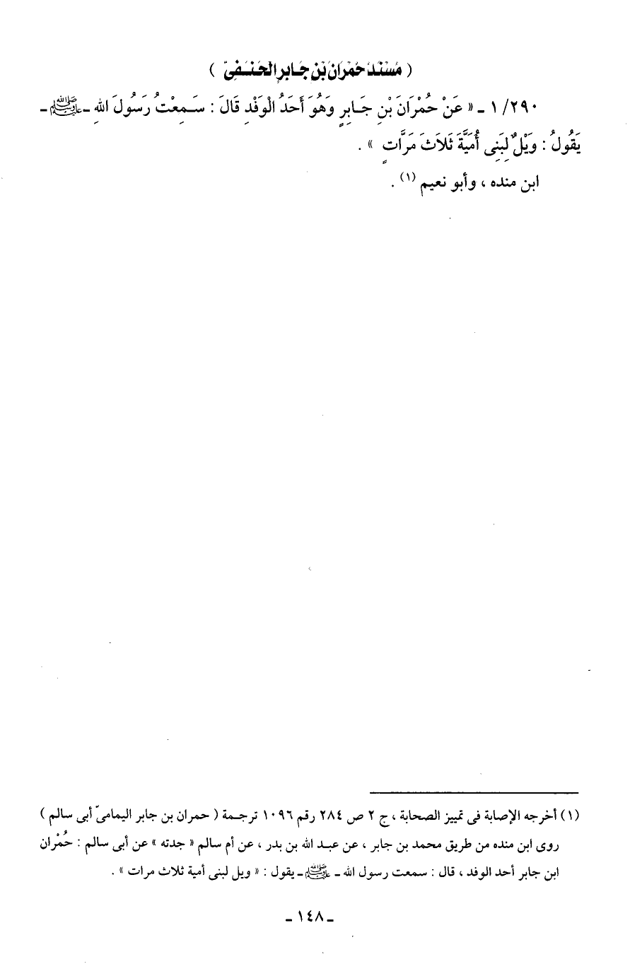 290/ 1 - " عَنْ حُمْرَانَ بْنِ جَابِرٍ وَهُوَ أَحَدُ الْوَفْدِ قَالَ: سَمِعْتُ رَسُولَ اللهِ - صلى الله عليه وسلم - يَقُولُ: وَيْلٌ لِبَنِى أُمَيَّةَ ثَلَاثَ مَرَّاتٍ".