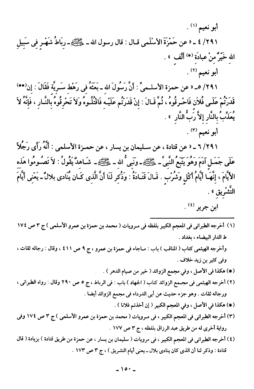 291/ 4 - "عن حَمْزَةَ الأسْلَمى قال: قال رسول الله - صلى الله عليه وسلم - رِبَاطُ شَهْرٍ فِى سَبِيلِ اللهِ خَيْرٌ مِنْ عبادَةِ (*) أَلْفٍ".