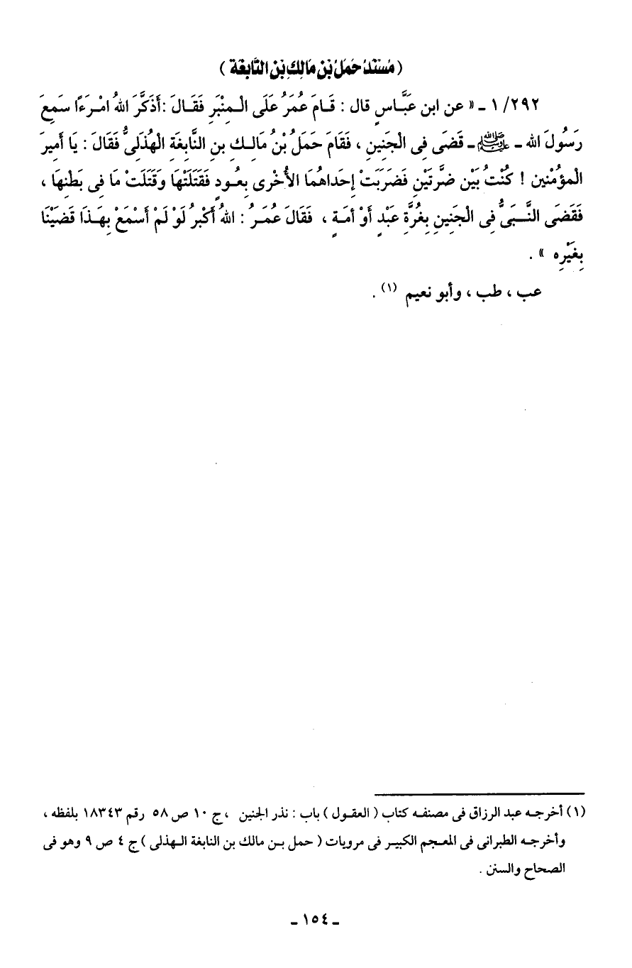 (¬1) أخرجه عبد الرزاق في مصنفه كتاب (العقول) باب: نذر الجنين، ج 10 ص 58 رقم 18343 بلفظه، وأخرجه الطبرانى في المعجم الكبير في مرويات (حمل بن مالك بن النابغة الهذلى) ج 4 ص 9 وهو في الصحاح والسنن.