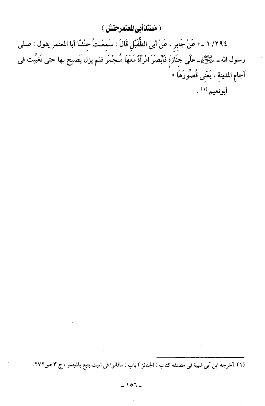 294/ 1 - " عَنْ جَابِرٍ، عَن أبى الطُّفَيْلِ قَالَ: سَمِعْتُ حنْشًا أبا المعتمر يقول: صلى رسول الله - صلى الله عليه وسلم - عَلَى جِنَازَةٍ فَأَبْصَرَ امْرَأَةً مَعَهَا مُجْمَر فلم يزل يَصبح بها حتى تَغيَّبت في آجامِ المدينةِ، يَعْنِى قُصُورَهَا".