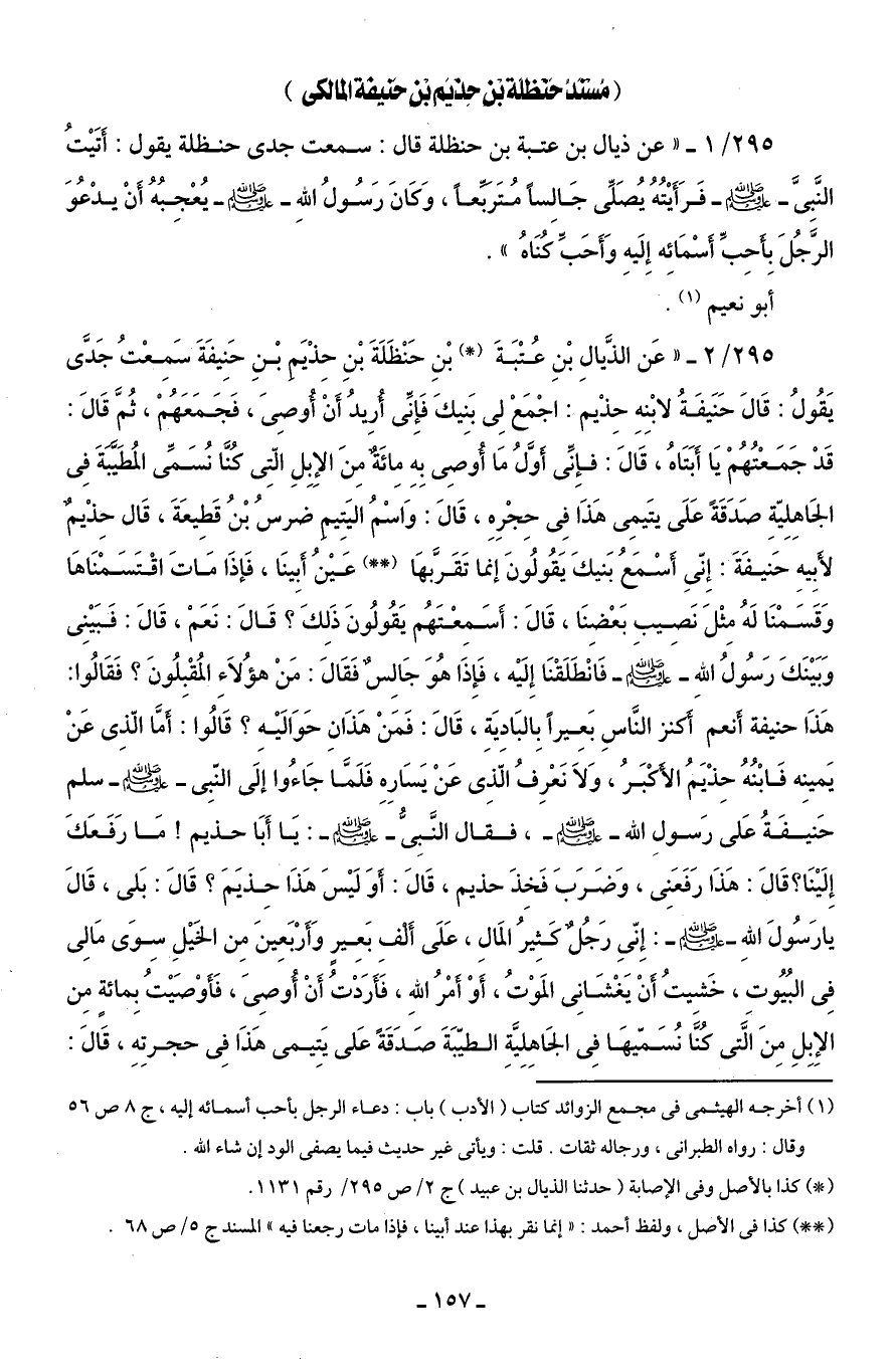295/ 2 - "عَن الذَّيالِ بْنِ عُتْبَةَ (*) بْنِ حَنْظَلَةَ بْنِ حِذْيَمِ بْنِ حَنِيفَةَ سَمِعْتُ جَدَّى يَقُولُ: قَالَ حَنيفَةُ لابْنِهِ حِذْيم؟ اجْمَعْ لِى بَنِيكَ فَإِنِّى أُرِيدُ أَنْ أُوصِىَ، فَجَمَعَهُمْ، ثُمَّ قَالَ: قَدْ جَمَعْتُهُمْ يَا أَبَتَاهُ، قَالَ: فإِنِّى أَوَّلُ مَا أُوصِى بِهِ مِائَةٌ مِنَ الإِبِلِ الّتِى كُنَّا نُسَمِّى المُطَيَّبَةَ فِى الجَاهِلِيّةِ صَدَقَةً عَلَى يَتِيمِى هَذَا فِى حِجْرِهِ، قَالَ: وَاسْمُ اليَتِيمِ ضرسُ بْنُ قَطِيعَةَ، قَال حِذْيمٌ لأَبِيهِ حَنيفَةَ: إِنّى أَسْمَعُ بَنيكَ يَقُولُونَ إنما تَقَرَّبهَا (* *) عَيْنُ أَبِينَا، فَإذَا مَاتَ اقْتَسَمْنَاهَا وَقَسَمْنَا لَهُ مِثْلَ نَصِيبِ بَعْضِنَا، قَالَ: أَسَمِعْتَهُم يَقُولُونَ ذَلِكَ؟ قَالَ: نَعَمْ، قَالَ: فَبَيْنِى وَبَيْنَكَ رَسُولُ اللهِ - صلى الله عليه وسلم - فَانْطَلَقْنَا إِلَيْه، فَإِذَا هُوَ جَالِسٌ فَقَالَ: مَنْ هؤُلَاءِ المُقْبِلُونَ؟ فَقَالُوا: هَذَا حنيفة أَنعم أَكنز النَّاسِ بَعِيرًا بِالبَادِيَةِ، قَالَ: فَمَنْ هَذَانِ حَوَالَيْهِ؟ قَالُوا: أَمَّا الّذِى عَنْ يَمينِه فَابْنُهُ حِذْيَمُ الأَكْبَرُ، وَلَا نَعْرِفُ الَّذِى عَنْ يَسَارِهِ فَلَمَّا جَاءُوا إلَى النّبِى - صلى الله عليه وسلم - سلم حَنيفَةُ عَلى رَسولِ الله - صلى الله عليه وسلم -، فقال النَّبِىُّ - صلى الله عليه وسلم -: يَا أَبَا حذيم! مَا رَفَعَكَ إِلَيْنَا؟ قَالَ: هَذَا رَفَعَنِى، وَضَرَبَ فَخِذَ حذيم، قَالَ: أَوَ لَيْسَ هَذَا حِذيَمَ؟ قَالَ: بَلى، قَالَ يا رَسُولَ اللهِ - صلى الله عليه وسلم -: إِنّىِ رَجُلٌ كَثِيرُ المَالِ، عَلَى أَلْفِ بَعِيرٍ وَأَرْبَعِينَ مِن الخَيْلِ سِوَى مَالِى فِى البُيُوتِ، خَشِيتُ أَنْ يَغْشَانِى المَوْتُ، أَوْ أَمْرُ اللهِ، فَأَرَدْتُ أَنْ أُوصِىَ، فَأَوْصَيْتُ بِمائةٍ مِن الإِبِلِ مِنَ الَّتى كُنَّا نُسَمّيهَا فِى الجَاهِلِيَّةِ الطيّبَةَ صَدَقَةً عَلى يَتِيمى هَذَا فِى حجرتِهِ، قَالَ:
