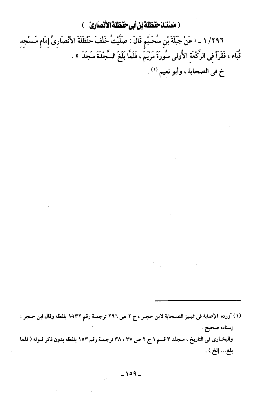 296/ 1 - " عَنْ جَبَلَةَ بْنِ سُحَيْمٍ قَالَ: صَلَّيْتُ خَلْفَ حَنْظَلَةَ الأَنْصَارِىِّ إِمَامِ مَسْجِدِ قُبَاء، فَقَرَأَ فِى الرَّكْعَةِ الأُولى سُورَةَ مَرْيَمَ، فَلَمَّا بَلَغَ السَّجْدَةَ سَجَدَ".