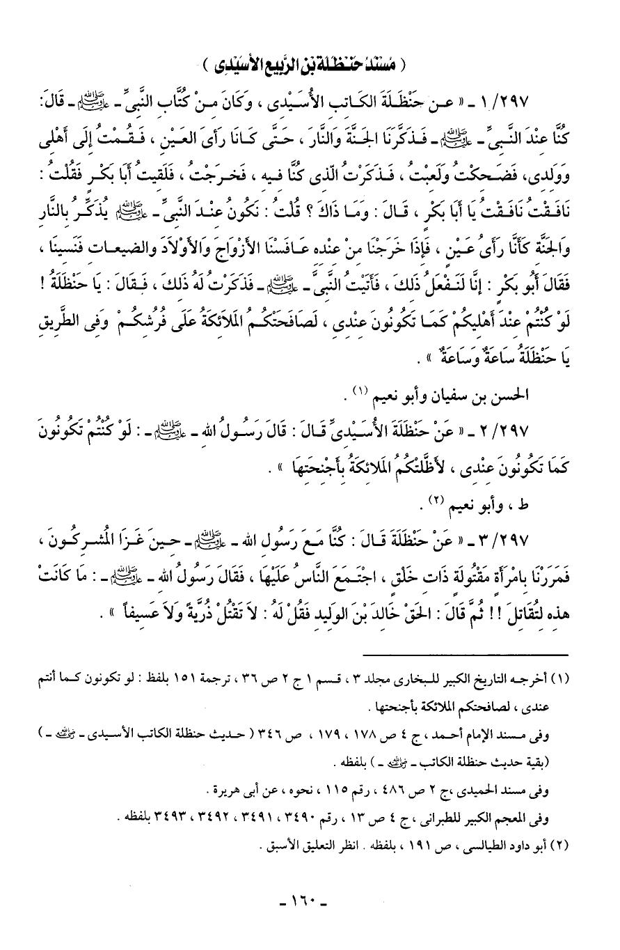 297/ 1 - " عن حَنْظَلَةَ الكَاتِبِ الأُسَيْدِى، وَكَانَ مِنْ كُتَّابِ النَّبِىِّ - صلى الله عليه وسلم - قَالَ: كُنَّا عِنْدَ النَّبِىِّ - صلى الله عليه وسلم - فَذَكَّرَنَا الجَنَّةَ وَالنَّارَ، حَتَّى كَانَا رَأىَ العَيْنِ، فَقُمْتُ إِلَى أَهْلِى وَوَلدِى، فَضَحِكْتُ وَلَعِبْتُ، فَذَكَرْتُ الّذِى كُنَّا فِيهِ، فَخرَجْتُ، فَلَقِيتُ أَبَا بَكْرٍ فَقُلْتُ: نَافَقْتُ نَافَقْتُ يَا أَبَا بَكْرٍ، قَالَ: وَمَا ذَاكَ؟ قُلْتُ: نَكُونُ عِنْدَ النَّبِىِّ - صلى الله عليه وسلم - يُذَكَّرُ بِالنَّارِ وَالجَنَّة كَأَنَّا رَأَىُ عَيْنٍ، فَإِذَا خَرَجْنَا مِنْ عِنْدِهِ عَافَسْنَا الأَزْوَاجَ وَالأَوْلَادَ والضيعاتِ فَنَسِينَا، فَقَالَ أَبُو بَكْرٍ: إنَّا لَنَفْعَلُ ذَلِكَ، فَأَتَيْتُ النَّبِىَّ - صلى الله عليه وسلم - فَذَكَرْتُ لَهُ ذَلِكَ، فقَالَ: يَا حَنْظَلَةُ! لَوْ كُنْتُمْ عِنْدَ أَهْلِيكُمْ كمَا تَكُونُونَ عِنْدِى، لَصَافَحَتْكُمُ المَلَائِكَةُ عَلَى فُرُشِكُمْ وَفِى الطَّرِيقِ يَا حَنْظَلَةُ سَاعَةٌ وَسَاعَةٌ".