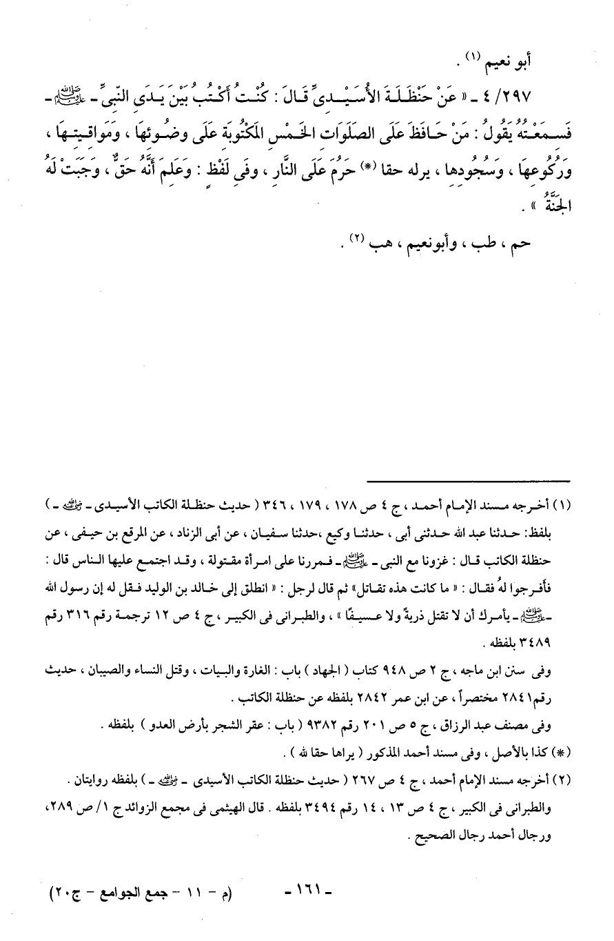 297/ 4 - "عَنْ حَنْظَلَةَ الأُسَيْدِىِّ قَالَ: كُنْتُ أَكْتُبُ بَيْنَ يَدَىِ النّبِىِّ - صلى الله عليه وسلم - فَسَمِعْتُهُ يَقُولُ: مَنْ حَافَظَ عَلَى الصَلَوَاتِ الخَمْسِ المَكْتُوبَةِ عَلَى وضُوئِهَا، وَمَواقِيتِهَا، وَرُكُوعِهَا، وَسُجُودِهِا، يرله حقا (*) حَرُمَ عَلَى النَّارِ، وَفِى لَفْظٍ: وَعَلِمَ أَنَّهُ حَقٌّ، وَجَبَتْ لَهُ الجَنَّةُ".