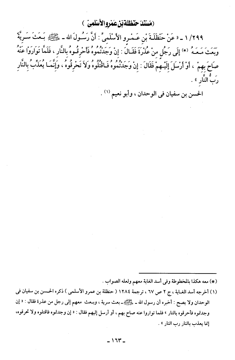 299/ 1 - " عَنْ حَنْظَلَةَ بْنِ عَمْرٍو الأَسْلَمِىِّ: أَنَّ رَسُولَ الله - صلى الله عليه وسلم - بَعَثَ سَرِيَّةً وَبَعَثَ مَعَهُ (*) إلَى رَجُلٍ مِنْ عُذْرَةَ فَقَالَ: إِنْ وَجَدْتُمُوهُ فَأَحْرِقُوهُ بِالنَّارِ، فَلَمَّا تَوَارَوْا عَنْهُ صَاحَ بِهِمْ، أَوْ أَرْسَلَ إِلَيْهِمْ فَقَالَ: إِنْ وَجَدْتُمُوهُ فَاقْتُلُوهُ وَلَا تَحْرِقُوهُ، وَإِنَّمَا يُعَذِّبُ بِالنَّارِ رَبُّ النَّارِ".