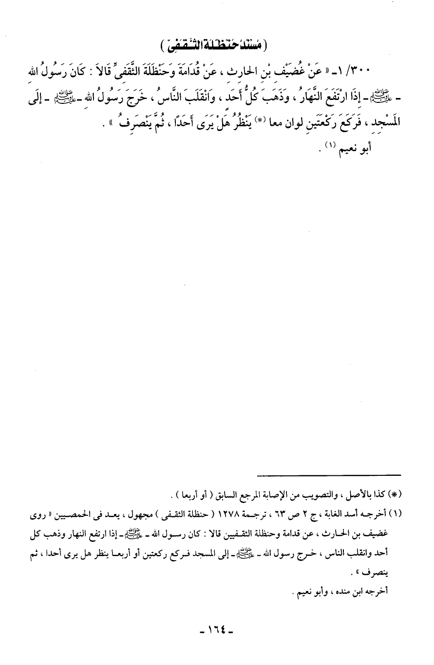 (¬1) أخرجه أسد الغابة، ج 2 ص 63، ترجمة 1278 (حنظلة الثقفى) مجهول، يعد في الحمصيين "روى غضيف بن الحارث، عن قدامة وحنظلة الثقفيين قالا: كان رسول الله - صلى الله عليه وسلم - إذا ارتفع النهار وذهب كل أحد وانقلب الناس، خرج رسول الله - صلى الله عليه وسلم - إلى المسجد فركع ركعتين أو أربعا ينظر هل يرى أحدا، ثم ينصرف".