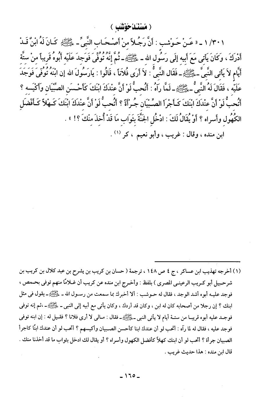 301/ 1 - " عَنْ حَوْشبٍ: أَنَّ رَجُلًا مِنْ أَصْحَابِ النَّبِىِّ - صلى الله عليه وسلم - كَانَ لَهُ ابْنٌ قَدْ أَدْرَكَ، وَكَانَ يَأتِى مَعَ أَبِيهِ إلَى رَسُولِ اللهِ - صلى الله عليه وسلم - ثُمَّ إِنَّهُ تُوُفِّىَ فَوَجِدَ عَلَيْهِ أَبُوهُ قَرِيبًا مِنْ سِتَّةِ أَيَّامٍ لَا يَأتِى النَّبِىَّ - صلى الله عليه وسلم - فَقَال النَّبِىُّ: لَا أَرَى فُلَانًا، قَالُوا: يَا رَسُولَ الله إن ابْنَهُ تُوُفّىَ فَوَجَدَ عَلَيْهِ، فَقَالَ لَهُ النَّبِىُّ - صلى الله عليه وسلم - لَمَّا رآهُ: أَتُحِبُّ لَوْ أَنَّ عِنْدَكَ ابْنَكَ كَأَحْسَنِ الصِّبْيَانِ وَأَكْيَسِهِ؟ أَتُحِبُّ لَوْ أَنَّ عِنْدَكَ ابْنَكَ كَأَجْرَأ الصِّبْيَانِ جُرْأَةً؟ أَتُحِبُّ لَوْ أَنَّ عِنْدَكَ ابْنَكَ كَهْلًا كَأَفْضَلِ الكُهُولِ وأَسراه؟ أَوْ يُقَالُ لَكَ: ادْخُلِ الجَنَّةَ بِثَوَابِ مَا قَدْ أُخِذَ مِنْكَ؟ ! ".