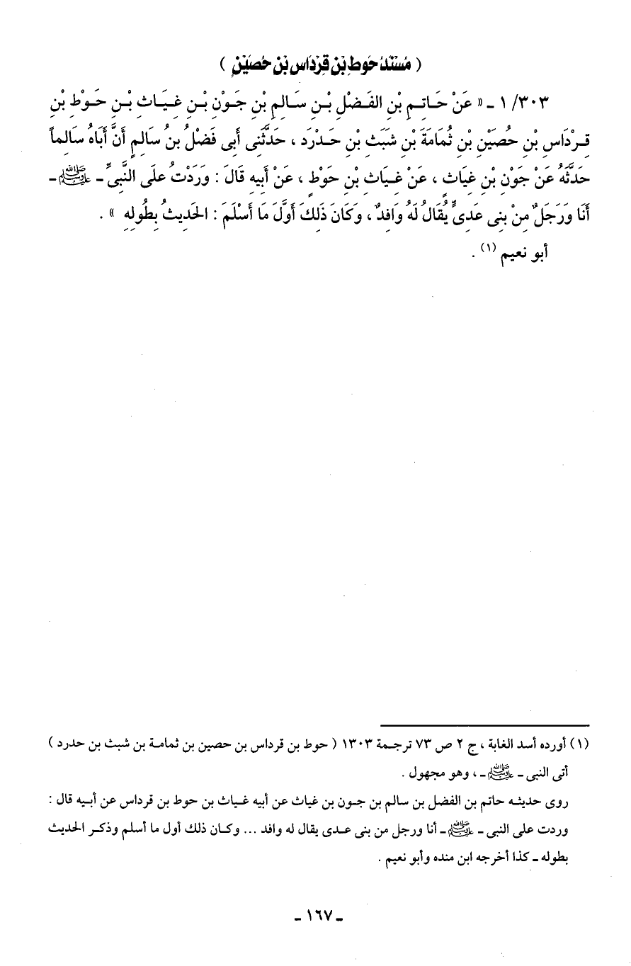 303/ 1 - " عَنْ حَاتِمِ بْنِ الفَضْلِ بْنِ سَالِمِ بْنِ جَوْنِ بْنِ غِيَاثِ بْنِ حَوْطِ بْنِ قِرْدَاسِ بْنِ حُصَيْنِ بْنِ ثُمَامَةَ بْنِ شَبَثِ بْنِ حَدْرَد، حَدَّثَنِى أَبِى فَضْلُ بنُ سَالِمٍ أَنَّ أَبَاهُ سَالِمًا حَدَّثَهُ عَنْ جَوْنِ بْنِ غِيَاثٍ، عَنْ غِيَاثِ بْنِ حَوْطٍ، عَنْ أَبِيهِ قَالَ: وَرَدْتُ علَى النَّبِىِّ - صلى الله عليه وسلم - أَنَا وَرَجلٌ مِنْ بنِى عَدِىٍّ يُقَالُ لَهُ وَافِدٌ، وَكَانَ ذَلِكَ أَوَّلَ مَا أَسْلَمَ: الحَدِيثُ بِطُولِهِ".