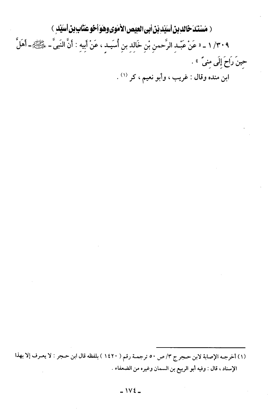 309/ 1 - " عَنْ عَبْدِ الرَّحمنِ بْنِ خَالِدِ بنِ أُسَيدٍ، عَنْ أَبِيهِ: أَنَّ النَّبىَّ - صلى الله عليه وسلم - أَهَلَّ حِينَ رَاحَ إِلَى مِنىً".