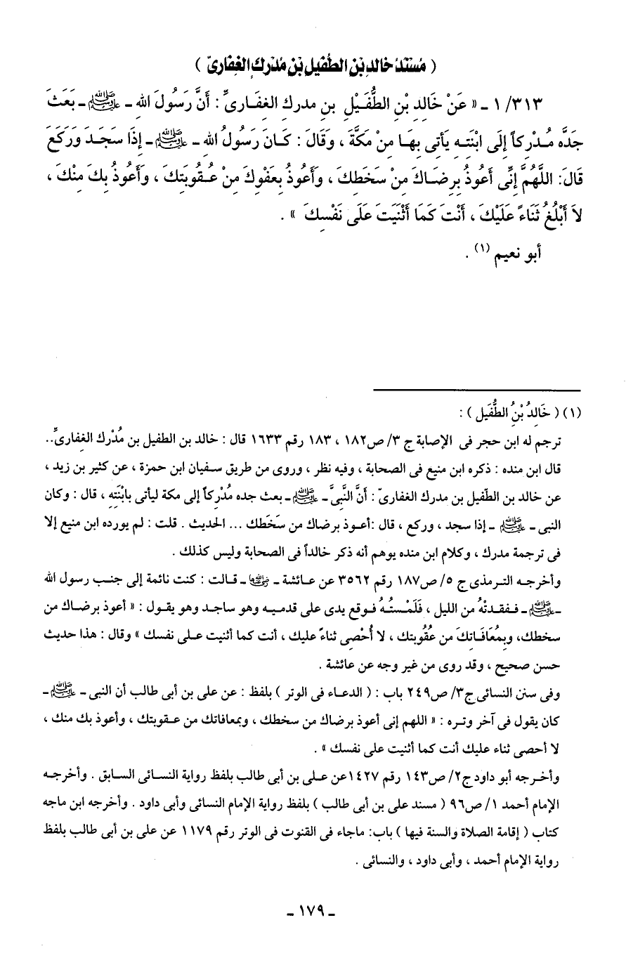 313/ 1 - " عَنْ خَالِدِ بْنِ الطُّفَيْلِ بْنِ مدركِ الغِفَارىِّ: أَنَّ رَسُولَ اللهِ - صلى الله عليه وسلم - بَعَثَ جَدَّه مُدْرِكًا إِلَى ابْنَتِهِ يَأتِى بِهَا مِنْ مَكَّةَ، وَقَالَ: كَانَ رَسُولُ اللهِ - صلى الله عليه وسلم - إِذَا سَجَدَ وَرَكَعَ قَالَ: اللَّهُمَّ إِنِّى أَعُوذُ بِرِضَاكَ مِنْ سَخَطِكَ، وَأَعُوذُ بِعَفْوِكَ مِنْ عُقُوبَتِكَ، وَأَعُوذُ بِكَ مِنْكَ، لَا أَبْلُغُ ثَنَاءً علَيْكَ، أَنْتَ كمَا أَثْنَيَتَ عَلَى نَفْسِكَ".