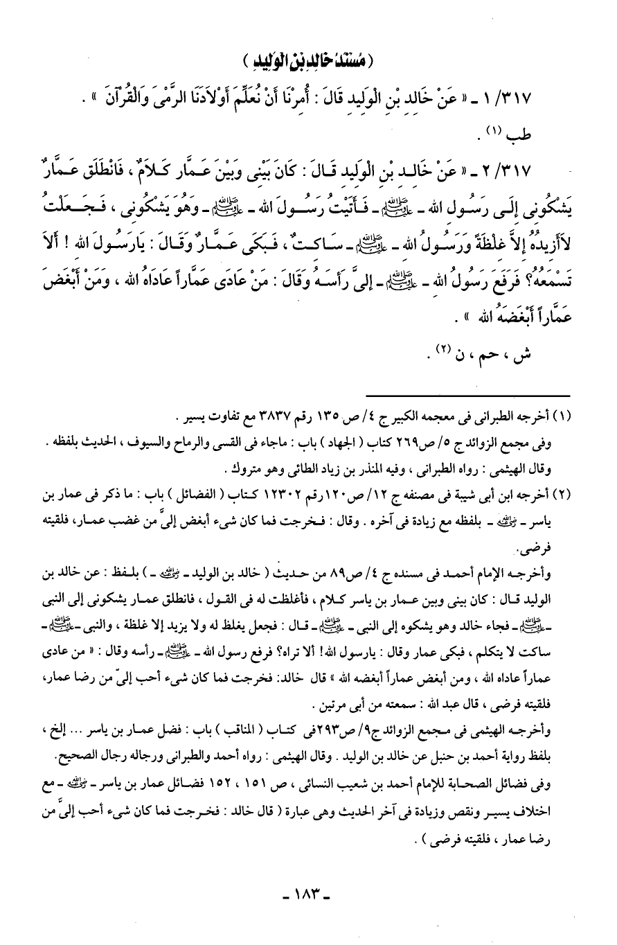 317/ 2 - "عَنْ خَالِد بْنِ الْوَلِيدِ قَالَ: كَانَ بَيْنِى وَبيْنَ عَمَّار كَلَامٌ، فَانْطَلَق عَمَّارٌ يَشْكُونِى إِلَى رَسُولِ الله - صلى الله عليه وسلم - فَأَتَيْتُ رَسُولَ الله - صلى الله عليه وسلم - وَهُوَ يَشْكُونِى، فَجَعَلْتُ لَا أَزِيدُهُ إِلَّا غِلْظَةً وَرَسُولُ اللهِ - صلى الله عليه وسلم - سَاكِتٌ، فَبَكَى عَمَّارٌ وَقَالَ: يَا رَسُولَ اللهِ! أَلَا تَسْمَعُهُ؟ فَرَفَعَ رَسُولُ اللهِ - صلى الله عليه وسلم - إلىَّ رَأسَهُ وَقَالَ: مَنْ عَادَى عَمَّارًا عَادَاهُ الله، وَمَنْ أَبْغَضَ عَمَّارًا أَبْغَضَهُ الله".