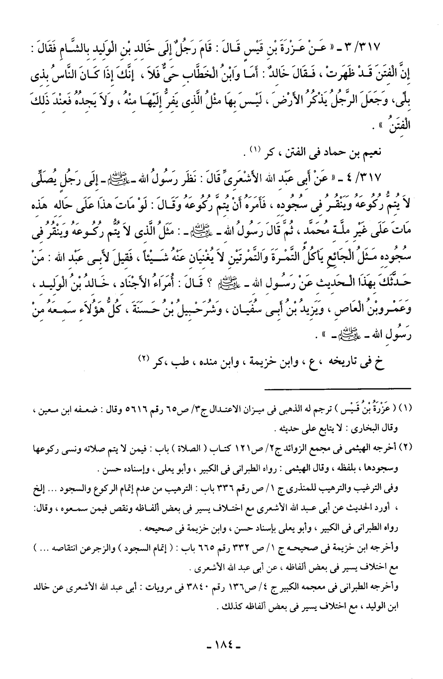 317/ 4 - "عَنْ أَبِى عَبْدِ الله الأَشْعَرِىِّ قَالَ: نَظَر رَسُولُ الله - صلى الله عليه وسلم - إِلَى رَجُلٍ يُصَلِّى لَا يُتِمُّ رُكُوعَهُ وَيَنْقُرُ فِى سُجُودِهِ، فَأَمَرَهُ أَنْ يُتِمَّ رُكُوعَهُ وَقَالَ: لَوْ مَاتَ هذَا عَلَى حَالِهِ هَذِه مَاتَ عَلَى غَيْرِ مِلَّةِ مُحَمَّدٍ، ثُمَّ قَالَ رَسُولُ اللهِ - صلى الله عليه وسلم -: مَثَلُ الَّذِى لَا يُتمُّ رُكُوعَهُ وَينْقُرُ فِى سُجُودِهِ مَثَلُ الْجَائِعِ يَأكُلُ التَّمْرَةَ وَالتَّمْرتَيْنِ لَا يُغْنِيَانِ عَنْهُ شَيْئًا، فَقِيلَ لأَبِى عَبْدِ الله: مَنْ حَدَّثَكَ بِهَذَا الْحَدِيثِ عَنْ رَسُولِ اللهِ - صلى الله عليه وسلم -؟ قَالَ: أُمَرَاءُ الأَجْنَادِ، خَالِدُ بْنُ الْوَلِيدِ، وَعَمْرو بْنُ الْعَاصِ، وَيَزِيدُ بْنُ أَبِى سُفيَان، وَشُرَحْبِيلُ بْنُ حَسَنَةَ، كُلُّ هَؤُلَاءِ سَمِعَهُ مِنْ رَسُولِ الله - صلى الله عليه وسلم -".