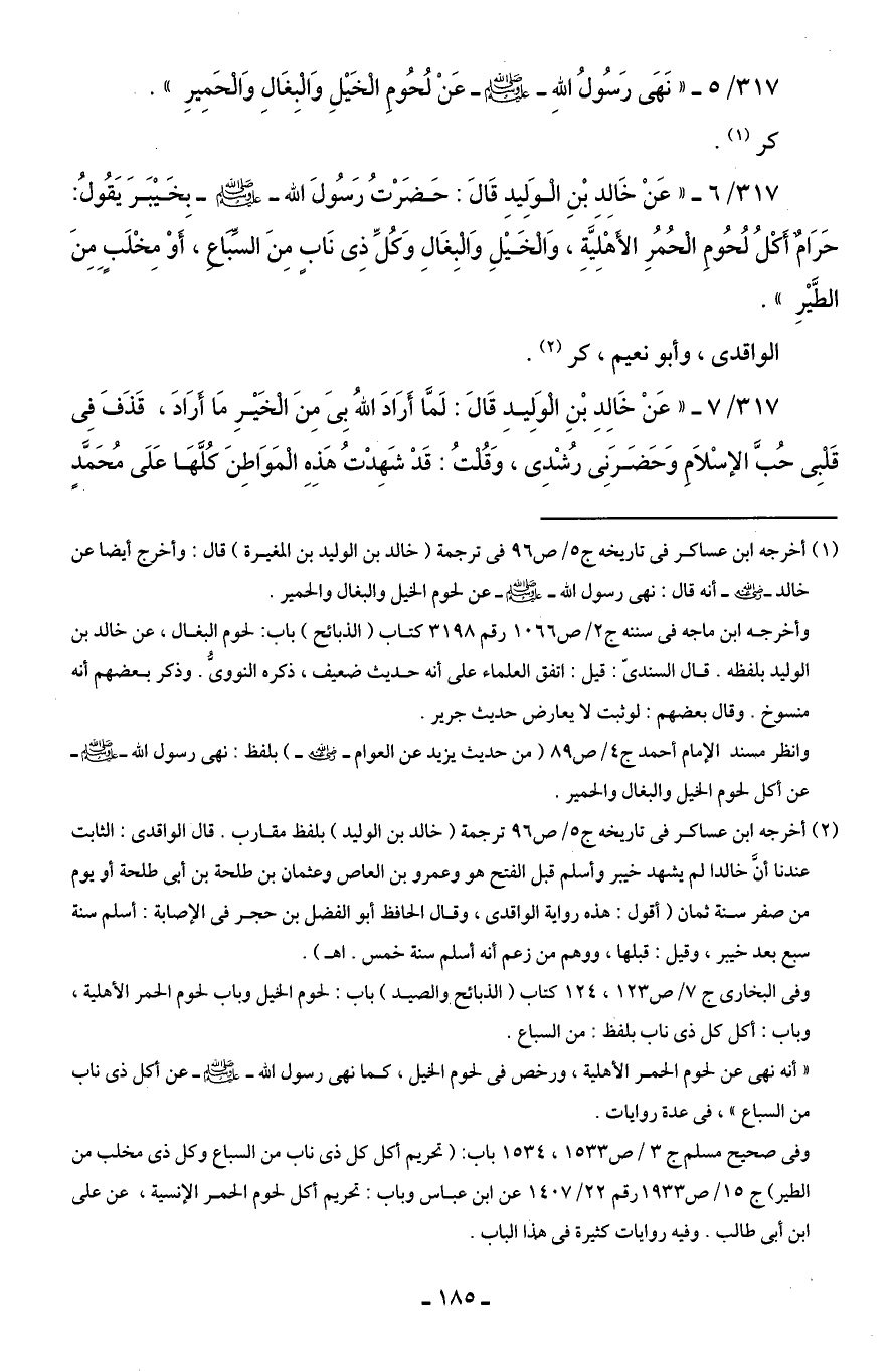 317/ 6 - "عَنْ خَالِدِ بْنِ الوَلِيدِ قَالَ: حَضَرْتُ رَسُولَ الله - صلى الله عليه وسلم - بِخَيْبَرَ يَقُولُ: حَرَامٌ أَكْلُ لُحُومِ الْحُمُرِ الأَهْلِيَّةِ، وَالخَيْلِ وَالْبِغَالِ وَكُلِّ ذِى نَابٍ مِنَ السِّبَاعِ، أوْ مِخْلَبٍ مِنَ الطَّيْرِ".