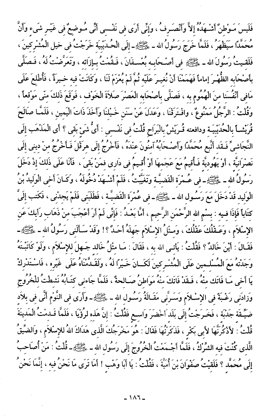 فَلَيسَ مَوْطِنٌ أَشْهَدُهُ إِلَّا وَأَنْصَرِفُ، وَإِنِّى أَرَى فِى نَفْسِى أَنِّى مُوضِعٌ فِى غَيْرِ شَئٍ وَأَنَّ مُحَمَّدًا سَيَظْهَرُ، فَلَمَّا خَرَجَ رَسُولُ الله - صلى الله عليه وسلم - إِلَى الْحُدَيْبِيَةِ خَرَجْتُ فِى خيل الْمُشْرِكِينَ، فَلَقِيتُ رَسُولَ الله - صلى الله عليه وسلم - فِي أَصْحَابِهِ بُعسْفَانَ، فَقُمْتُ بِإِزَائِهِ، وَتَعَرَّضْتُ لَهُ، فَصَلَّى بأَصْحَابِهِ الظُّهْرَ إمامًا فَهَمَمْنَا أَنْ نُغِيرَ عَلَيْهِ ثُمَّ لَمْ يُعْزَمْ لَنَا، وَكَانَتْ فِيهِ خِيرَةٌ، فَأُطْلِعَ عَلَى مَا فِى أنْفُسَنا مِنَ الْهُمُومِ بِهِ، فَصَلَّى بِأَصْحَابِهِ الْعَصْرَ صَلَاةَ الْخَوْفِ، فَوَقَعَ ذَلِكَ مِنّى مَوْقِعًا، وَقُلْتُ: الرَّجُلُ مَمْنُوعٌ، وافْتَرَقْنَا، وَعَدَلَ عَنْ سَنَنِ خَيْلِنَا وَأَخَذَ ذَاتَ الْيَمِينِ، فَلَمَّا صَالَحَ قُرَيْشًا بِالْحُدَيْبِيَةِ ودافعته قُرَيْشٌ بِالْبَرَاحِ قُلْتُ فِى نَفْسِى: أَىُّ شَيءٍ بَقِى؟ أَى الْمَذْهَب إِلَى النَّجَاشِىِّ فَقَدِ أَتَّبع مُحَمَّدًا وَأَصْحَابُهُ آمِنُونَ عِنْدَهُ، فَأَخْرُجُ إِلَى هِرَقْلَ فَأَخْرُجُ مِنْ دِينِى إِلَى نَصْرَانِيَّةٍ، أَوْ يَهُودِيَّةٍ فَأُقِيمُ مَعَ عَجَمِهَا أَوْ أُقِيمُ فِى دَارِى فمَنْ بَقِىَ، فَأنَا عَلَى ذَلِكَ إِذْ دَخَلَ رَسُولُ اللهِ - صلى الله عليه وسلم - فِى عُمْرَةِ الْقَضِيَّةِ وَتَغَيَّبْتُ، فَلَمْ أَشْهَدْ دُخُولَهُ، وَكَانَ أَخِى الْوَلِيدُ بْنُ الْوَلِيدِ قَدْ دَخَلَ مَعَ رَسُولِ الله - صلى الله عليه وسلم - فِى عُمْرَةِ القَضِيَّةِ، فَطَلَبَنِى فَلَمْ يَجِدْنِى، فَكَتب إِلَىَّ كِتَابًا فَإِذَا فِيهِ: بِسْمِ اللهِ الرَّحْمَنِ الرَّحِيمِ، أَمَّا بَعْدُ: فَإِنِّى لَمْ أَرَ أَعْجَبَ مِنْ ذَهَابِ رَأيِكَ عَنِ الإِسْلَامِ، وَعَقْلُكَ عَقْلُكَ، وَمِثْلُ الإِسْلَامِ جَهِلَهُ أَحَدٌ؟ ! وَقَدْ سَأَلَنِى رَسُولُ اللهِ - صلى الله عليه وسلم - فَقَالَ: أيْنَ خَالِدٌ؟ فَقُلْتُ: يَأتِى الله بِهِ، فَقَالَ: مَا مِثْلُ خَالِدٍ جَهِلَ لِلإِسْلَامِ، وَلَوْ كَاتَبْتَهُ وَجَدْتهُ مَعَ الْمُسْلِمِين عَلَى الْمُشْرِكِينَ لَكَانَ خَيْرًا لَهُ، وَلَقَدَّمْنَاهُ عَلَى غَيْرِهِ، فَاسْتَدْرِكْ يَا أَخِى مَا فَاتَك مِنْهُ، فَقَدْ فَاتَكَ مِنْهُ مَوَاطِنُ صَالِحةٌ، فَلَمَّا جَاءنِى كِتَاُبهُ نَشِطْتُ لِلْخُرُوجِ وَزادَنِى رَغْبةً فِى الإِسْلَامِ وَسَرَّنِى مَقَالَةُ رَسُولِ اللهِ - صلى الله عليه وسلم - وَأَرَى فِى النَّوْمِ أَنَّى فِى بِلَادٍ ضَيِّقَة جَدْبَةٍ، فَخَرَجْتُ إِلَى بَلَدٍ أخْضَرَ وَاسِعٍ فَقُلْتُ. إِنَّ هَذِهِ لرُؤْيَا، فَلَمَّا قَدِمْتُ المَدينَةَ قُلْتُ: لأَذْكُرَنَّهَا لأَبِى بَكْرٍ، فَذَكَرْتُهَا فَقَالَ: هُوَ مَخْرَجُكَ الَّذِى هَدَاكَ اللهُ للإِسْلَامِ، وَالضيَّقُ الَّذِى كُنْتَ فِيهِ الشِّرْكُ، فَلَمَّا أَجْمَعْتُ الْخُرُوجَ إِلَى رَسُولِ اللهِ - صلى الله عليه وسلم - قُلْتُ: مَنْ أُصَاحِبُ إِلَى مُحَمَّدٍ؟ فَلَقِيْتُ صَفْوَانَ بْنَ أُمَيَّةَ، فَقُلْتُ: يَا أَبَا وَهْبٍ! أَمَا تَرَى مَا نَحْنُ فِيهِ، إِنَّمَا نَحْنُ
