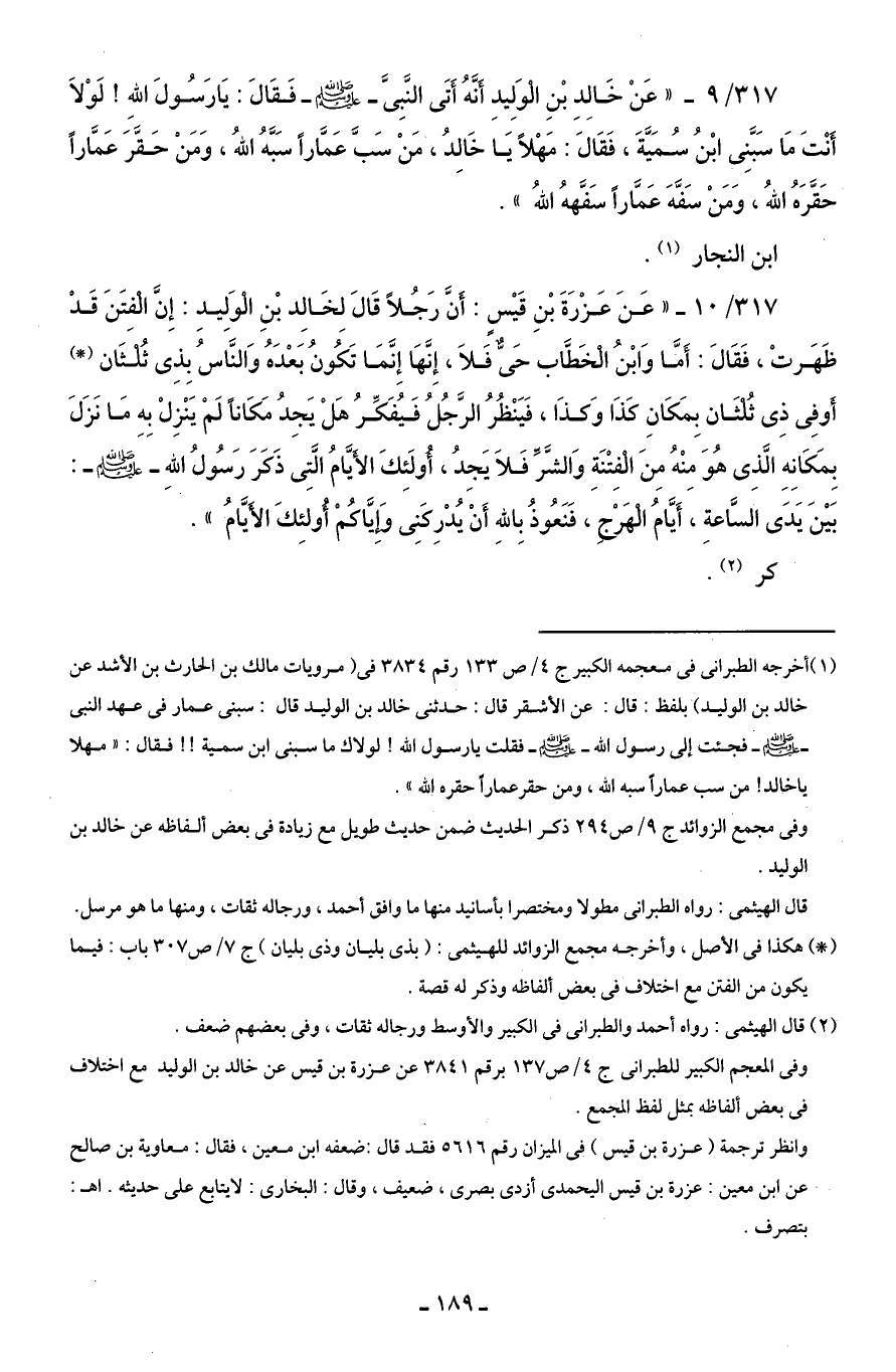 317/ 9 - "عَنْ خَالِدِ بْنِ الْوَلِيدِ أَنَّهُ أَتَى النَّبِىَّ - صلى الله عليه وسلم - فَقَالَ: يَا رَسُولَ اللهِ! لَوْلَا أَنْتَ مَا سَبَّنِى ابْنُ سُمَيَّةَ، فَقَالَ: مَهْلًا يَا خَالِدُ، مَنْ سَبَّ عَمَّارًا سَبَّهُ اللهُ، وَمَنْ حَقَّرَ عَمَّارًا حَقَّرَهُ اللهُ، وَمَنْ سَفَّهَ عَمَّارًا سَفَّههُ اللهُ".