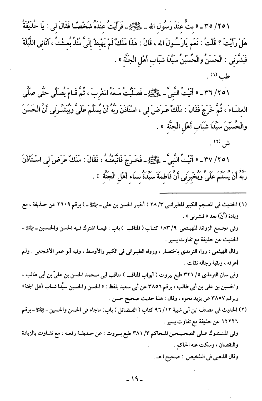251/ 35 - "بِتُّ عِنْدَ رَسُولِ الله - صلى الله عليه وسلم - فَرَأَيْتُ عِنْدَهُ شَخْصًا فَقَالَ لِى: يَا حُذَيْفَةُ هَلْ رَأَيْتَ؟ قُلْتُ: نَعَم يَا رَسُولَ الله، قَالَ: هَذَا مَلَكٌ لَمْ يَهْبِطْ إِلَىَّ مُنْذُ بُعِثْتُ، أَتَانِى اللَّيْلَةَ فَبَشَّرَنِى: الْحَسَنُ والحُسَيْنُ سيِّدَا شَبَابِ أَهْلِ الْجَنَّةِ".