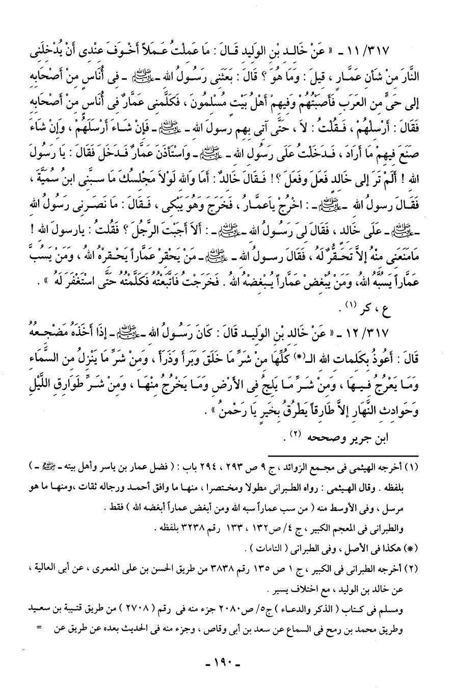 317/ 11 - "عَنْ خَالِدِ بْنِ الوَلِيدِ قَالَ: مَا عَمِلْتُ عَمَلًا أَخْوَفَ عِنْدِى أَنْ يُدْخِلَنِى النَّارَ مِنْ شَأنِ عَمَّارٍ، قِيلَ: وَمَا هُوَ؟ قَالَ: بَعَثَنِى رَسُولُ الله - صلى الله عليه وسلم - فِى أُنَاسٍ مِنْ أَصْحَابِهِ إلى حَىٍّ مِن العَرَبِ فَأَصَبْتُهُمْ وَفِيهِمْ أَهْلُ بَيْتٍ مُسْلِمُونَ، فَكَلَّمنِى عَمَّارٌ فِى أُنَاسٍ مِنْ أَصْحَابِهِ فَقَالَ: أَرْسِلْهُمْ، فَقُلْتُ: لَا، حَتَّى آتِى بِهِم رسولَ اللهِ - صلى الله عليه وسلم - فَإنْ شَاءَ أَرْسَلَهُمْ، وَإِنْ شَاءَ صَنَعَ فِيهِمْ مَا أَرَادَ، فَدَخَلْتُ عَلَى رَسُولِ اللهِ - صلى الله عليه وسلم - وَاسْتَأذَنَ عَمَّارٌ فَدَخَلَ فَقَالَ: يَا رَسُولَ اللهِ! أَلَمْ تَرَ إلى خَالِدٍ فَعَلَ وفَعَلَ؟ ! فَقَالَ خَالِدٌ: أَمَا وَاللهِ لَوْلَا مَجْلِسُكَ مَا سبَّنِى ابنُ سُمَيَّةَ، فَقَالَ رسولُ اللهِ - صلى الله عليه وسلم -: اخْرُجْ يَا عمَّارُ، فَخَرَجَ وَهُوَ يَبْكِى، فَقَالَ: مَا نَصَرنِى رَسُولُ اللهِ - صلى الله عليه وسلم - عَلَى خَالِدٍ، فَقَالَ لِىَ رَسُولُ اللهِ - صلى الله عليه وسلم -: أَلَا أَجَبْتَ الرَّجُلَ؟ فَقُلتُ: يا رسولَ اللهِ! مَا مَنَعَنِى مِنْهُ إلَّا تَحَقُّرٌ لَهُ، فَقَالَ رسولُ اللهِ - صلى الله عليه وسلم - مَنْ يَحْقِرْ عَمَّارًا يَحْقِرْهُ اللهُ، وَمَنْ يَسُبَّ عَمَّارًا يَسُبَّهُ اللهُ، وَمَنْ يُبْغِضْ عَمَّارًا يُبْغِضْهُ اللهُ. فَخَرَجْتُ فَاتَّبَعْتُهُ فَكَلَّمْتُهُ حَتَّى اسْتَغْفَرَ لَهُ".