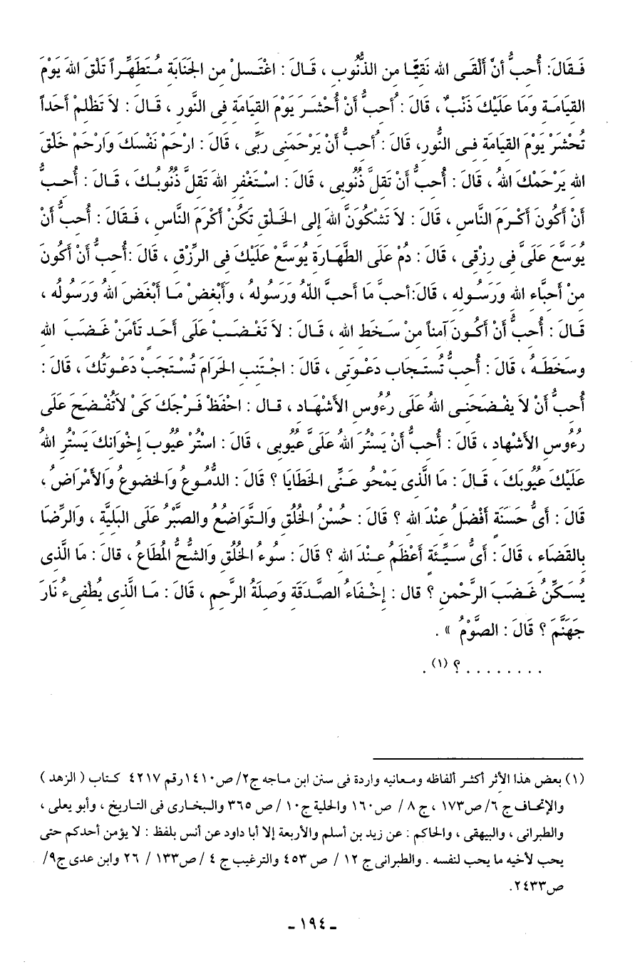 فَقَالَ: أُحِبُّ أنْ أَلْقَى الله نَقِيًّا مِن الذُّنُوبِ، قَالَ: اغْتَسلْ مِن الجَنَابَةِ مُتَطَهِّرًا تَلْقَ اللهَ يَوْمَ القِيَامَةِ وَمَا عَلَيْكَ ذَنْبٌ، قَالَ: أُحِبُّ أَنْ أُحْشَرَ يَوْمَ القِيَامَةِ فِى النَّورِ، قَالَ: لَا تَظْلِمْ أَحَدًا تُحْشَرْ يَوْمَ القِيَامَةِ فِى النُّورِ، قَالَ: أُحِبُّ أَنْ يَرْحَمَنِى رَبَّى، قَالَ: ارْحَمْ نَفْسَكَ وَارْحَمْ خَلْقَ اللهِ يَرْحَمْكَ اللهُ، قَالَ: أُحِبُّ أَنْ تَقِلَّ ذُنُوبِى، قَالَ: اسْتَغْفِرِ اللهَ تَقِلَّ ذُنُوبُكَ، قَالَ: أُحِبُّ أَنْ أَكُونَ أَكْرَمَ النَّاسِ، قَالَ: لَا تَشْكُوَنَّ اللهَ إِلى الخَلْقِ تَكُنْ أَكْرَمَ النَّاسِ، فَقَالَ: أُحِبُّ أنْ يُوَسَّعَ علَىَّ فِى رِزْقِى، قَالَ: دُمْ عَلَى الطَّهَارةِ يُوَسَّعْ عَلَيْكَ فِى الرِّزقِ، قَالَ: أُحِبُّ أَنْ أَكُونَ مِنْ أَحِبَّاءِ الله وَرَسُولِهِ، قَالَ: أحبَّ مَا أَحبَّ اللهُ وَرَسُولهُ، وَأَبْغِضْ مَا أَبْغَضَ اللهُ وَرَسُولُه، قَالَ: أُحِبُّ أَنْ أَكُونَ آمِنًا مِنْ سَخَطِ اللهِ، قَالَ: لَا تَغْضَبْ عَلَى أَحَدٍ تَأمَنْ غَضَبَ اللهِ وسَخَطَهُ، قَالَ: أُحِبُّ تُستَجَاب دَعْوَتِى، قَالَ: اجْتَنِبِ الحَرَامَ تُسْتَجَبْ دَعْوَتُكَ، قَالَ: أُحِبُّ أنْ لَا يفْضَحَنِى اللهُ عَلَى رُءُوسِ الأَشْهَادِ، قال: احْفَظْ فَرْجَكَ كَىْ لَا تُفْضَحَ عَلَى رُءُوسِ الأَشْهادِ، قَالَ: أُحِبُّ أَنْ يَسْتُرَ اللهُ عَلَىَّ عُيُوبِى، قَالَ: اسْتُرْ عُيُوبَ إِخْوَانِكَ يَسْتُرِ اللهُ عَلَيْكَ عُيُوبَكَ، قَالَ: مَا الَّذِى يَمْحُو عَنِّى الخَطَايَا؟ قَالَ: الدُّمُوعُ وَالخضوعُ وَالأَمْرَاضُ، قَالَ: أَىُّ حَسَنَةٍ أَفْضَلُ عِنْدَ اللهِ؟ قَالَ: حُسْنُ الخُلُقِ وَالتَّوَاضُعُ والصَّبْرُ عَلَى البَلِيَّةِ، وَالرِّضَا بِالقَضَاءِ، قَالَ: أَىُّ سَيِّئَةٍ أَعْظَمُ عِنْدَ اللهِ؟ قَالَ: سُوءُ الخُلُقِ وَالشُّحُّ المُطَاعُ، قالَ: مَا الَّذِى يُسَكِّنُ غَضَبَ الرَّحْمنِ؟ قال: إِخْفَاءُ الصَّدَقَةِ وَصِلَةُ الرَّحِمِ، قَالَ: مَا الَّذِى يُطْفِئُ نَارَ جَهَنَّمَ؟ قَالَ: الصَّوْمُ".