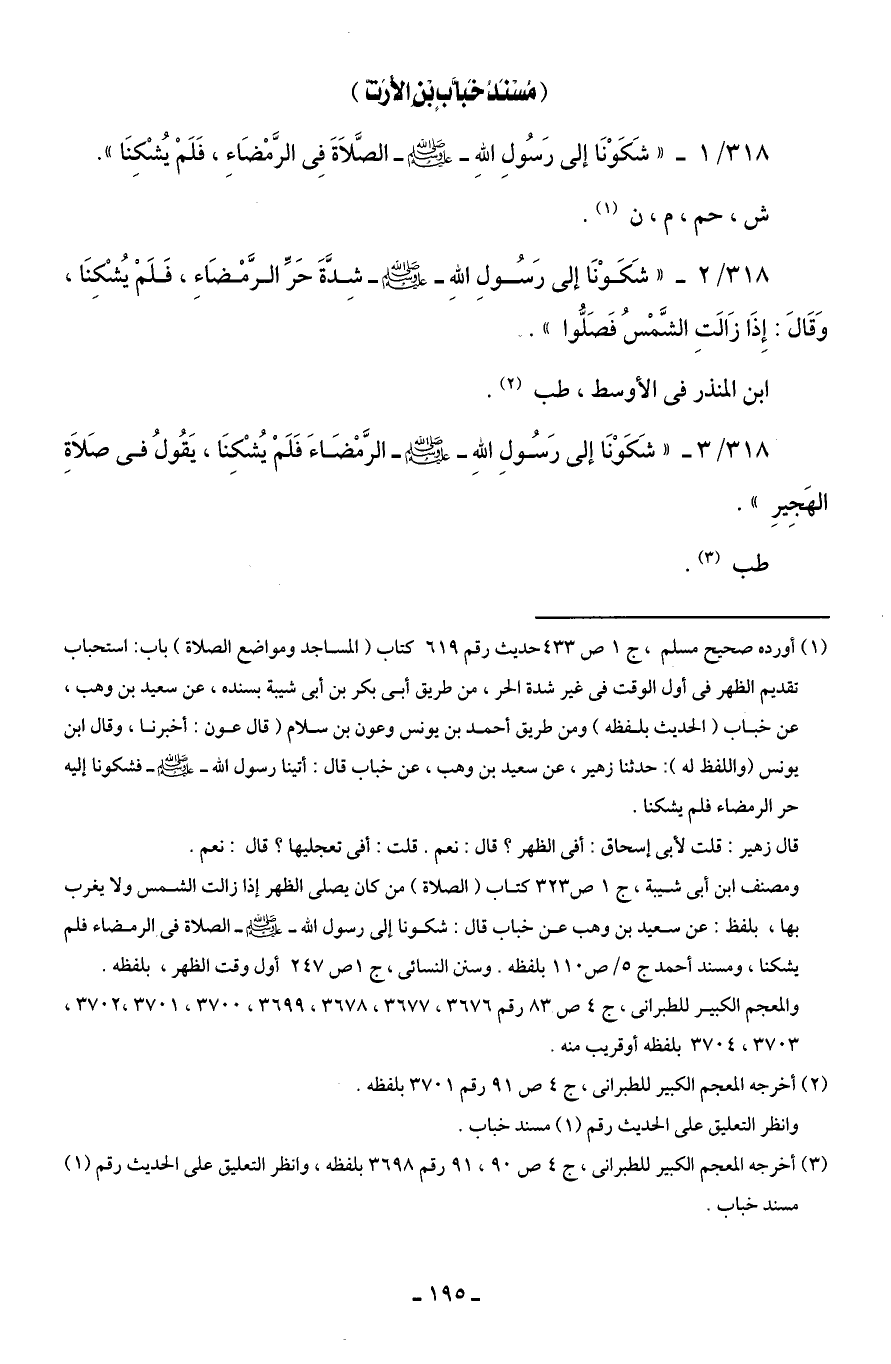 ومصنف ابن أبى شيبة، ج 1 ص 323 كتاب (الصلاة) من كان يصلى الظهر إذا زالت الشمس ولا يغرب بها، بلفظ: عن سعيد بن وهب عن خباب قال: شكونا إلى رسول الله - صلى الله عليه وسلم - الصلاة في الرمضاء فلم يشكنا، ومسند أحمد ج 5/ ص 110 بلفظه. وسنن النسائى، ج 1 ص 247 أول وقت الظهر، بلفظه.
