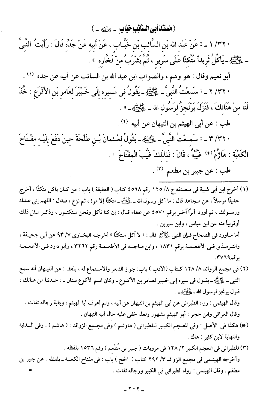 320/ 1 - " عَنْ عَبْدِ الله بْنِ السَّائِبِ بْنِ خَبَّابٍ، عَنْ أَبِيهِ عَنْ جَدِّهِ قَالَ: رَأَيْتُ النَّبِىَّ - صلى الله عليه وسلم - يَأكُلُ ثَرِيدًا مُتَّكِئًا عَلَى سَرِيرٍ، ثُمَّ يَشْرَبُ مِنْ فَخَّارِهِ".