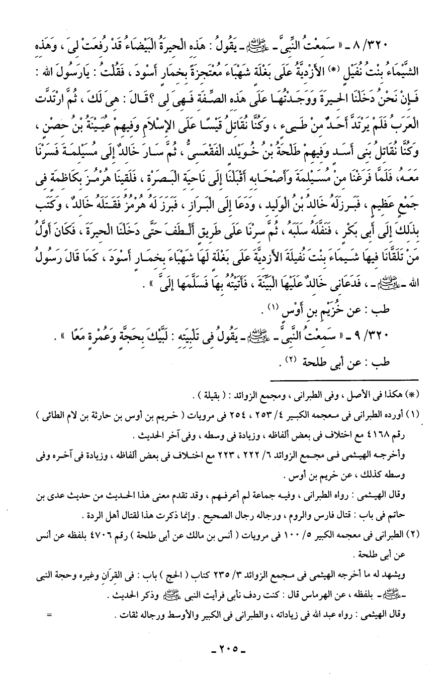 320/ 8 - "سَمِعْتُ النَّبِىَّ - صلى الله عليه وسلم - يَقُولُ: هَذِهِ الْحِيرَةُ الْبَيْضَاءُ قَدْ رُفِعَتْ لِىَ، وَهَذِهِ الشَّيْمَاءُ بِنْتُ نُفَيْلٍ (*) الأَزْدِيَّةُ عَلَى بَغْلَةٍ شَهْبَاءَ مُعْتَجِزَةً بِخِمَارٍ أَسْودَ، فَقُلْتُ: يَا رَسُولَ الله: فَإِنْ نَحْنُ دَخَلْنَا الحِيرَةَ وَوَجَدْتُهَا عَلَى هَذِهِ الصِّفَةِ فَهِىَ لِى؟ قَالَ: هِىَ لَكَ، ثُمَّ ارْتَدَّت الْعَرَبُ فَلَمْ يَرْتَدَّ أَحَدٌ مِنْ طَيئٍ، وَكُنَّا نُقَاتِلُ قَيْسًا عَلَى الإِسْلَامِ وَفِيهِمْ عُيَيْنَةُ بْنُ حِصْنٍ، وَكُنَّا نُقَاتِلُ بَنِى أَسَدٍ وَفِيهِمْ طَلْحَةُ بْنُ خُوَيْلدٍ الْفَقْعَسِىُّ، ثُمَّ سَارَ خَالِدٌ إِلَى مُسَيْلِمَةَ فَسَرْنَا مَعَهُ، فَلَمَّا فَرَغْنَا مِنْ مُسَيْلِمَةَ وَأَصْحَابِهِ أَقْبَلْنَا إِلَى نَاحِيَةِ الْبَصَرْةِ، فَلَقِينَا هُرْمُزَ بِكَاظِمَةٍ فِى جَمْعٍ عَظِيمٍ، فَبَرزَ لَهُ خَالِدُ بْنُ الْوَلِيدِ، وَدَعَا إِلَى الْبَرَازِ، فَبَرَزَ لَهُ هُرْمُزُ فَقَتَلَهُ خَالِدٌ، وَكَتَب بِذَلِكَ إِلَى أَبِى بَكْرٍ، فَنَفَّلَهُ سَلَبَهُ، ثُمَّ سِرْنَا عَلَى طَرِيقٍ أَلْطَفَ حَتَّى دَخَلْنَا الْحِيرَةَ، فَكَانَ أَوَّلُ مَنْ تَلَقَّانَا فِيهَا شَيمَاءَ بِنْتَ نُفيلَةَ الأَزدِيَّةَ عَلَى بَغْلَةٍ لَهَا شَهْبَاءَ بِخِمَارٍ أَسْوَدَ، كمَا قَالَ رَسُولُ الله - صلى الله عليه وسلم -، فَدَعَانِى خَالِدٌ عَلَيْهَا الْبَيِّنَةَ، فَأَتَيْتُهُ بِهَا فَسَلَّمَها إلَىَّ".