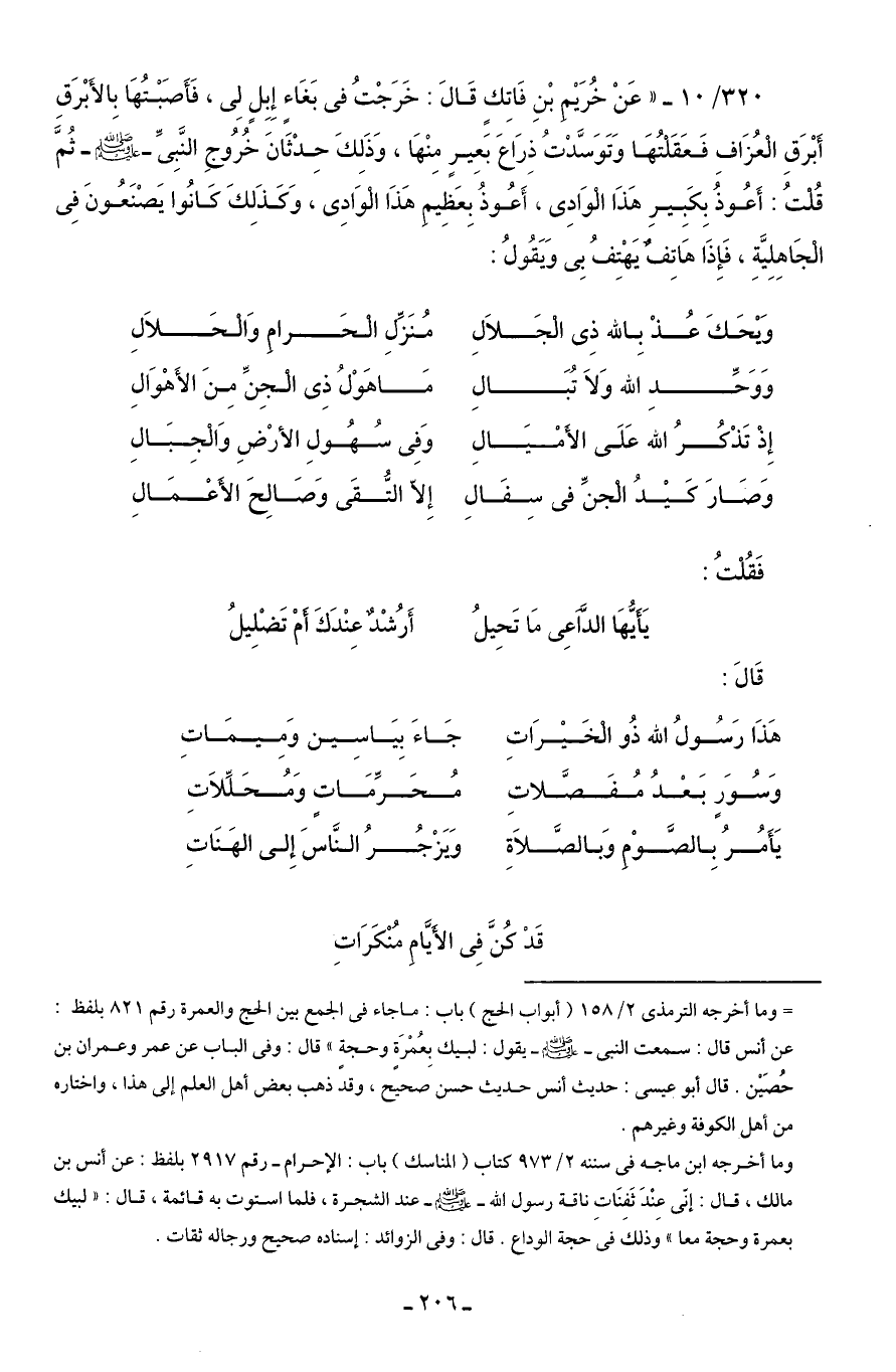 320/ 10 - "عَنْ خُرَيْمِ بْنِ فَاتِكٍ قَالَ: خَرَجْتُ في بَغَاءٍ إِبِلٍ لِى، فَأَصَبْتُهَا بِالأَبْرَقِ أَبْرَقِ الْعُزَافِ فَعَقَلْتُهَا وَتَوَسَّدْتُ ذِرَاعَ بَعِيرٍ مِنْهَا، وَذَلِكَ حِدْثَانَ خُرُوجِ النَّبِىِّ - صلى الله عليه وسلم - ثُمَّ قُلْتُ: أَعُوذُ بِكَبِيرِ هَذَا الْوَادِى، أَعُوذُ بِعَظِيمِ هَذَا الْوَادِى، وَكذَلِكَ كَانُوا يَصْنَعُونَ فِى الْجَاهِلِيَّةِ، فَإِذَا هَاتِفٌ يَهْتِفُ بِى وَيَقُولُ: