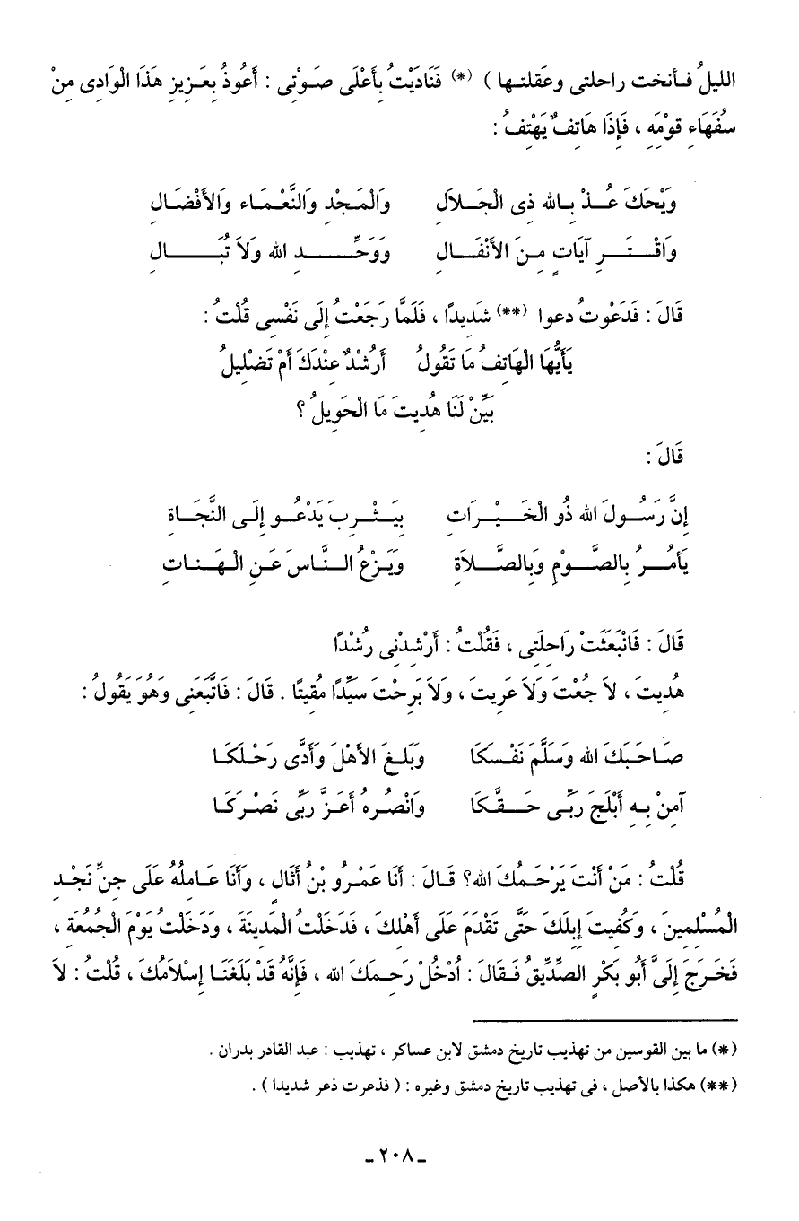 الليلُ فأنخت راحلتى وعَقلتها) (*) فَنَادَيْتُ بِأَعْلَى صَوْتِى: أَعُوذُ بِعَزِيزِ هَذَا الْوَادِى مِنْ سُفَهَاءِ قوْمِهِ، فَإِذَا هَاتِفٌ يَهْتِفُ: