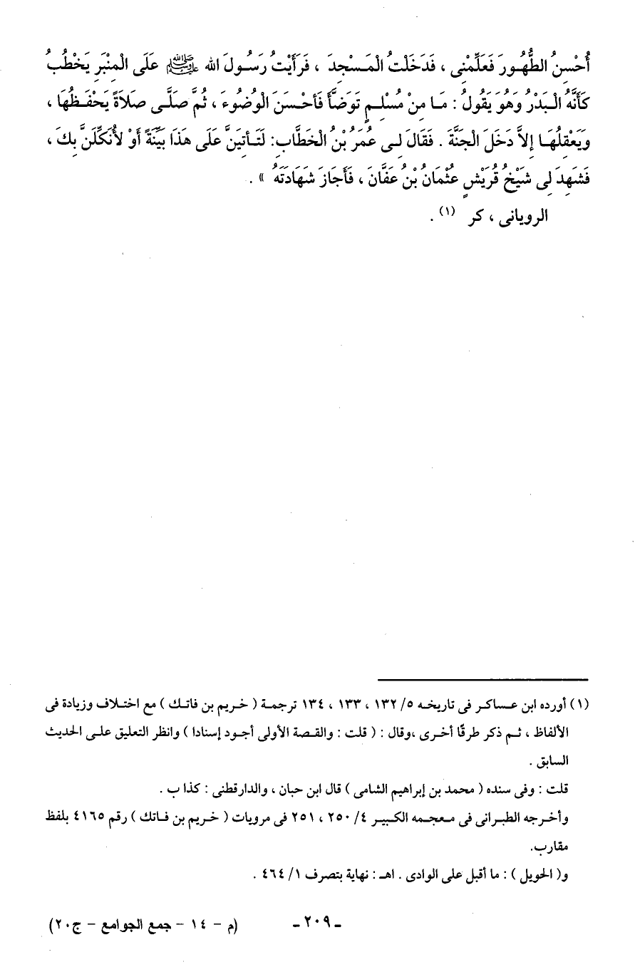 أُحْسِنُ الطُّهُورَ فَعَلِّمْنِى، فَدَخَلْتُ الْمَسْجِدَ، فَرَأَيْتُ رَسُولَ الله - صلى الله عليه وسلم - عَلَى الْمِنْبَرِ يَخْطُبُ كَأَنَّهُ الْبَدْرُ وَهُوَ يَقُولُ: مَا مِنْ مُسْلِمٍ تَوَضَّأَ فَأحْسَنَ الْوُضُوءَ، ثُمَّ صَلَّى صَلَاةً يَحْفَظُهَا، وَيَعْقِلُهَا إِلَّا دَخَلَ الْجَنَّةَ. فَقَالَ لِى عُمَرُ بْنُ الْخَطَّابِ: لَتَأتِيَنَّ عَلَى هَذَا بَيِّنَةً أَوْ لأُنَكِّلَنَّ بِكَ، فَشَهِدَ لِى شَيْخُ قُرَيْشٍ عُثْمَانُ بْنُ عَفَّانَ، فَأَجَازَ شَهَادَتَهُ".