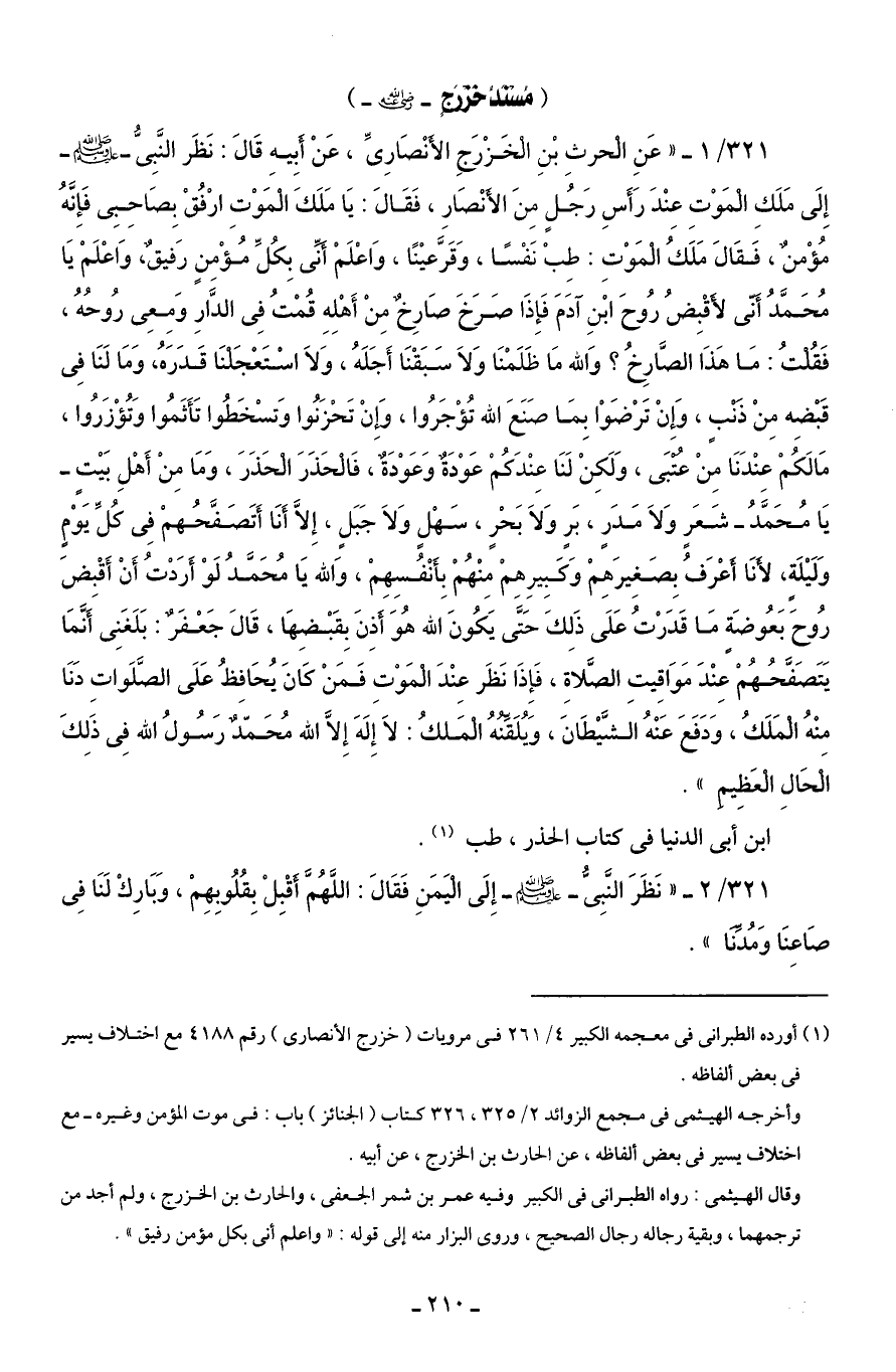 321/ 1 - " عَنِ الْحرثِ بْنِ الْخَزْرَجِ الأَنْصَارِىِّ، عَنْ أَبِيهِ قَالَ: نَظَر النَّبِىُّ - صلى الله عليه وسلم - إِلَى مَلَكِ الْمَوْتِ عِنْدَ رَأَسِ رَجُلٍ مِنَ الأَنْصَارِ، فَقَالَ: يَا مَلَكَ الْمَوْتِ ارْفُقْ بِصَاحِبِى فَإِنَّهُ مُؤْمنٌ، فَقَالَ مَلَكُ الْمَوْتِ: طِبْ نَفْسًا، وَقَرَّ عيْنًا، وَاعْلَمْ أَنَّى بِكُلِّ مُؤْمِنٍ رَفيقٌ، وَاعْلَمْ يَا مُحَمَّدُ أَنّى لأَقْبِضُ رُوحَ ابْنِ آدَمَ فَإِذَا صَرَخَ صَارِخٌ مِنْ أَهْلِهِ قُمْتُ فِى الدَّارِ وَمِعِى رُوحُهُ، فَقُلْتُ: مَا هَذَا الصَّارِخُ؟ وَالله مَا ظَلَمْنَا وَلَا سَبَقْنَا أَجَلَهُ، وَلَا اسْتَعْجَلْنَا قَدَرَهُ، وَمَا لَنَا فِى قَبْضِه مِنْ ذَنْبٍ، وَإنْ تَرْضَوْا بِمَا صَنَعَ الله تُؤْجَرُوا، وَإِنْ تَحْزَنُوا وَتسْخَطُوا تَأَثَمُوا وَتُؤْزَرُوا، مَا لَكُمْ عِنْدَنَا مِنْ عُتْبَى، وَلَكِنْ لَنَا عِنْدَكُمْ عَوْدَةٌ وَعَوْدَةٌ، فَالْحَذَرَ الْحَذَرَ، وَمَا مِنْ أَهْلِ بَيْتٍ - يَا مُحَمَّدُ - شَعَرٍ وَلَا مَدَرٍ، بَرٍ وَلَا بَحْرٍ، سَهْلٍ وَلَا جَبَلٍ، إِلَّا أَنَا أَتَصَفَّحُهمْ فِى كُلِّ يَوْمٍ وَلَيْلَةٍ، لأَنَا أَعْرَفُ بِصَغِيرِهِمْ وَكَبِيرِهِمْ مِنْهُمْ بِأَنْفُسِهِمْ، وَالله يَا مُحَمَّدُ لَوْ أَرَدْتُ أَنْ أَقْبِضَ رُوحَ بَعُوضَةٍ مَا قَدَرْتُ عَلَى ذَلِكَ حَتَّى يَكُونَ الله هُوَ أَذِنَ بِقَبْضِهَا، قَالَ جَعْفَرٌ: بَلَغَنِى أَنَّمَا يَتَصَفَّحُهُمْ عِنْدَ مَوَاقِيتِ الصَّلاةِ، فَإِذَا نَظَر عنْدَ الْمَوْتِ فَمَنْ كَانَ يُحَافِظُ عَلَى الصَّلَواتِ دَنَا مِنْهُ الْمَلَكُ، وَدَفَعَ عَنْهُ الشَّيْطَانَ، وَيُلَقَّنُهُ الْمَلكُ: لَا إِلَهَ إِلَّا الله مُحَمّدٌ رَسُولُ الله فِى ذَلِكَ الْحَالِ الْعَظِيمِ".