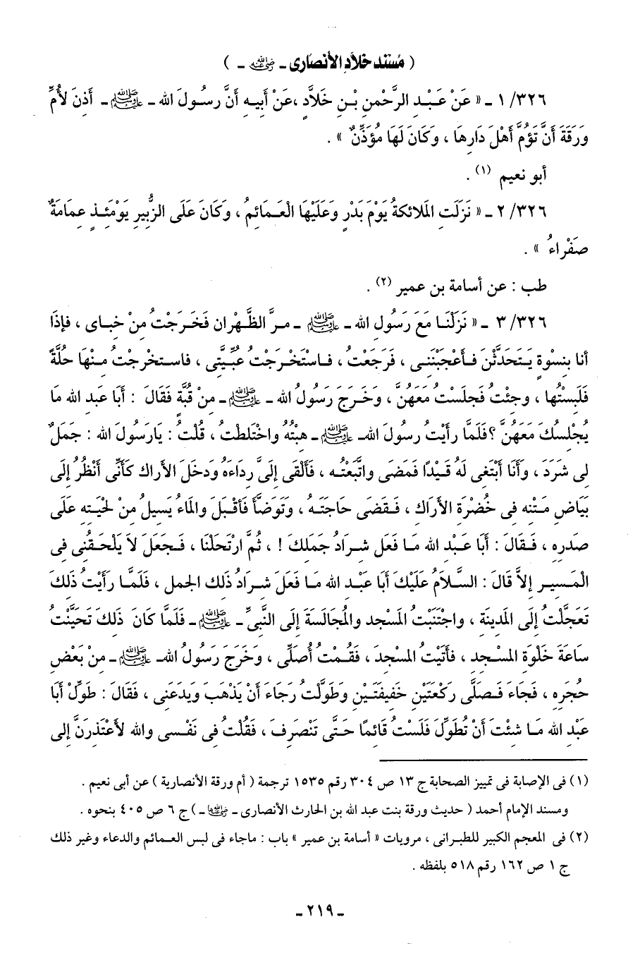 326/ 1 - " عَنْ عَبْدِ الرَّحْمنِ بْنِ خَلَّادٍ، عَنْ أَبِيهِ أَنَّ رسُولَ الله - صلى الله عليه وسلم - أَذِنَ لأُمِّ وَرَقَةَ أَنَّ تَؤُمَّ أَهْلَ دَارِهَا، وَكَانَ لَهَا مُؤَذِّنٌ".